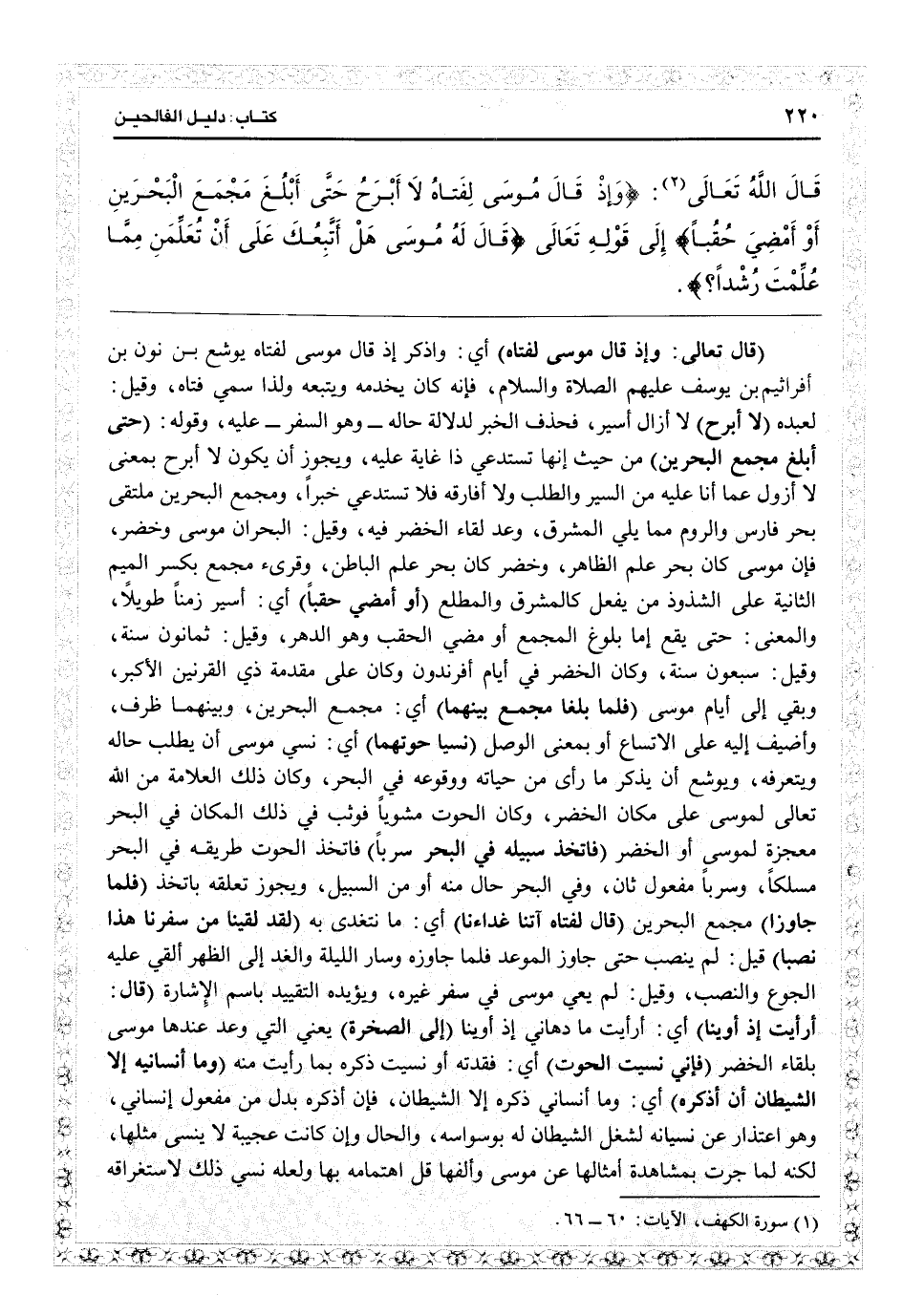 (قال تعالى: {وإذ قال موسى لفتاه} ) أي واذكر إذ قال موسى لفتاه يوشع بن نون بن أفراثيم بن يوسف عليهم الصلاة والسلام، فإنه كان يخدمه ويتبعه ولذا سمي فتاه وقيل لعبده {لا أبرح} لا أزال أسير فحذف الخبر لدلالة حاله وهو السفر عليه، وقوله ( {حتى بلغ مجمع البحرين} ) من حيث إنها تستدعي ذا غاية عليه، ويجوز أن يكون لا أبرح بمعنى لا أزول عما أنا عليه من السير والطلب ولا أفارقه فلا تستدعى خبراً، ومجمع البحرين ملقتى بحر فارس والروم مما يلي المشرق، وعد لقاء الخضر فيه، وقيل البحر أن موسى وخضر فإن موسى كان بحر علم الظاهر، وخضر كان بحر علم الباطن، وقرىء مجمع بكسر الميم الثانية على الشذوذ من يفعل كالمشرق والمطلع {أو أمضي حقباً} أي أسير زمناً طويلاً؛ والمعنى: حتى يقع إما بلوغ المجمع أو مضي الحقب وهو الدهر، وقيل ثمانون سنة، وقيل سبعون سنة، وكان الخضر في أيام أفرندون وكان على مقدمة ذي القرنين الأكبر وبقي إلى أيام موسى ( {فلما بلغا مجمع بينهما} ) أي مجمع البحرين، وبينهما ظرف وأضيف إليه على الاتساع أو بمعنى الوصل ( {نسيا حوتهما} ) أي نسي موسى أن يطلب حاله ويتعرفه ويوشع أن يذكر ما رأى من حياته وووقعه في البحر، وكان ذلك العلامة من الله تعالى لموسى على مكان الخضر، وكان الحوت مشوياً فوثب في ذلك المكان في البحر معجزة لموسى أو الخضر ( {فاتخذ سبيله في البحر سرباً} ) فاتخذ الحوت طريقه في البحر مسلكاً وسرباً مفعول ثان وفي البحر حال منه أو من السبيل ويجوز تعلقه باتخذ ( {فلما جاوزا} ) مجمع البحرين ( {قال لفتاه آتنا غداءنا} ) أي ما نتغذى به ( {لقد لقينا من سفرنا هذا نصباً} ) قيل لم ينصب حتى جاوز الموعد فلما جاوزه وسأل الليلة والغد إلى الظهر ألقي عليه الجوع والنصب، وقيل لم يعي موسى في سفر غيره ويؤيده التقييد باسم الإشارة ( {قال: أرأيت إذ أوينا} ) أي أرأيت ما دهاني إذ أوينا ( {إلى الصخرة} ) يعني التي وعد عندها موسى بلقاء الخضر