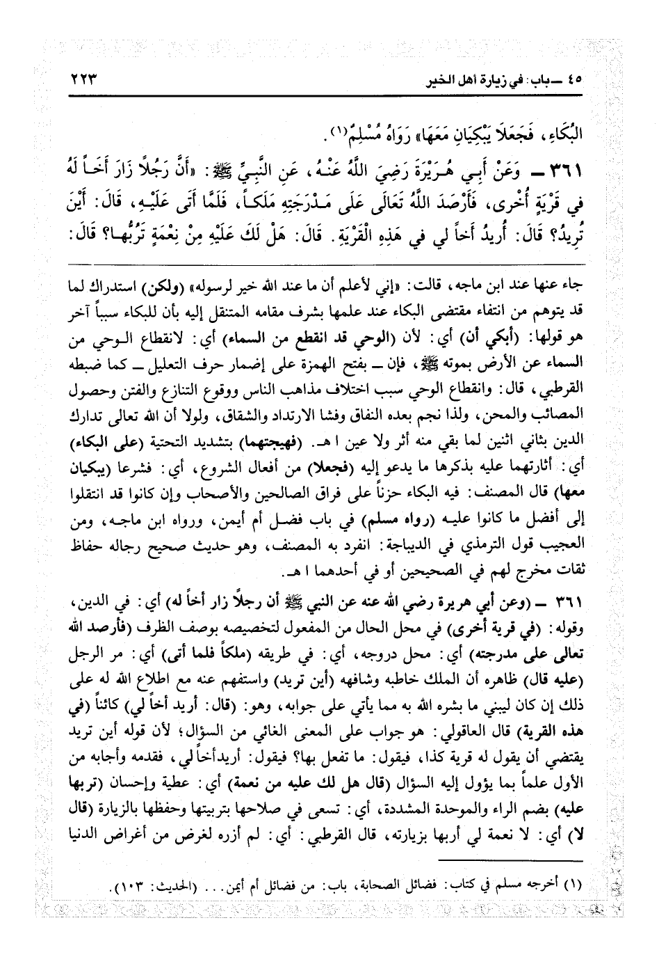 2361 - (وعن أبي هريرة رضي الله عنه عن النبي أن رجلاً زار أخاً له) أي في الدين، وقوله: (في قرية أخرى) في محل الحال من المفعول لتخصيصه بوصف الظرف (فأرصد الله تعالى على مدرجته) أي محل دروجه: أي في طريقه (ملكاً فلما أتى) أي مر الرجل (عليه قال) ظاهره أن الملك خاطبه وشافهه (أين تريد) واستفهم عنه مع إطلاع الله له على ذلك إن كان ليبني ما بشره الله به مما يأتي على جوابه وهو (قال أريد أخاً لي) كائناً (في هذه القرية) قال العاقولي: هو جواب على المعنى الغائي من السؤال، لأن قوله أين تريد؟ يقتضي أن يقول له قرية كذا، فيقول ما تفعل بها؟ فيقول أريد أخاً لي، فقدمه وأجابه من الأول علماً بما يؤول إليه السؤال (قال: هل لك عليه من نعمة) أي عطية بالزيارة (قال لا) أي لا نعمة لي أربها بزيارته. قال القرطبي: أي لم أزره لغرض من أغراض الدنيا