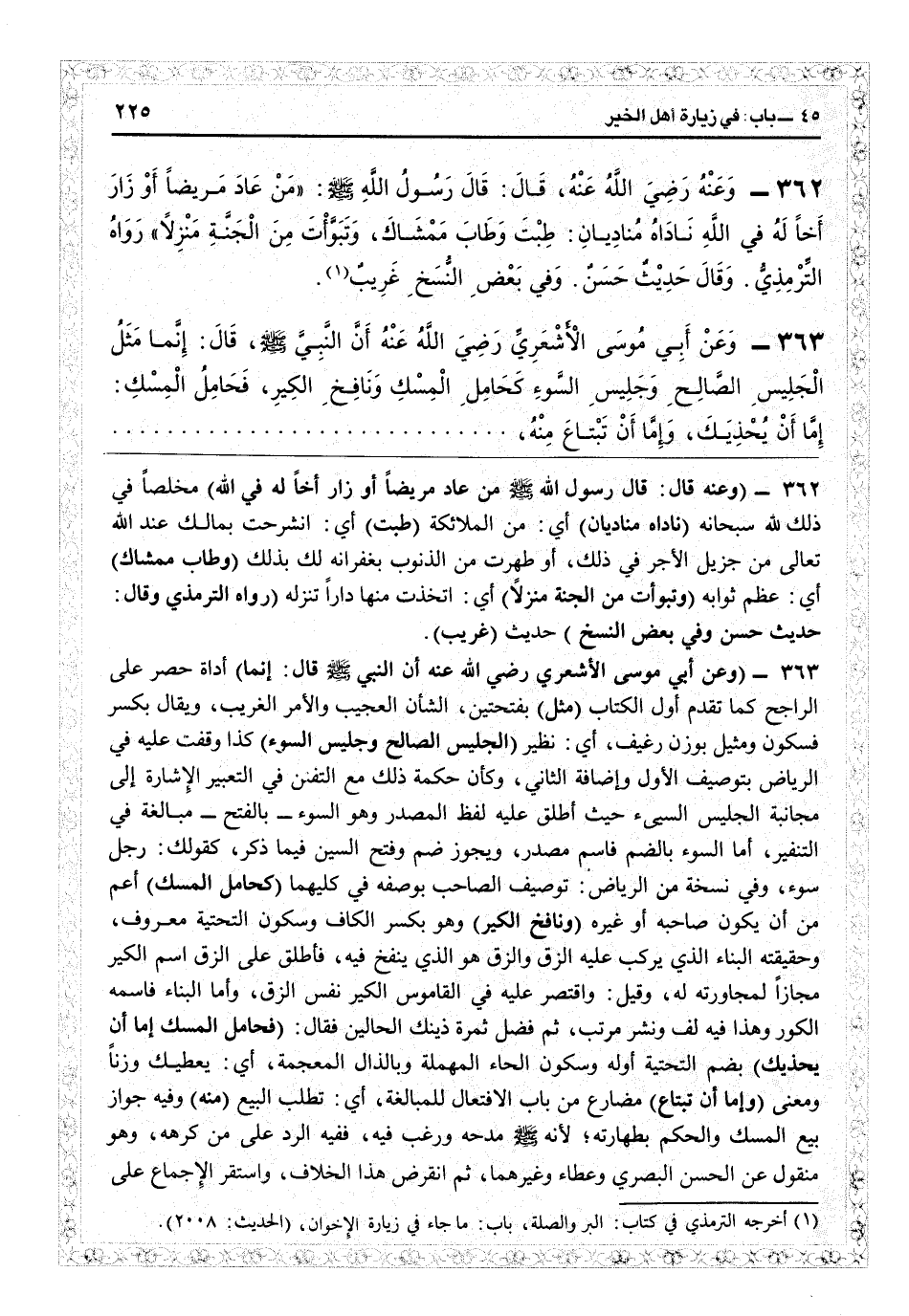4363 - (وعن أبي موسى الأشعري رضي الله عنه أن النبيّ قال: إنما) أداة حصر على الراجح كما تقدم أول الكتاب (مثل) بفتحتين الشأن العجيب والأمر الغريب، ويقال بكسر فسكون، وميل بوزن رغيف: أي نظير (الجليس الصالح وجليس السوء) كذا وقفت عليه في الرياض بتوصيف الأوّل وإضافة الثاني، وكأن حكمة ذلك مع التفنن في التعبير الإشارة إلى مجانبة الجليس السيء حيث أطلق عليه لفظ المصدر وهو السوء - بالفتح - مبالغة في التنفير، أما السوء بالضم فاسم مصدر ويجوز ضم وفتح السين فيما ذكر كقولك رجل سوء وفي نسخة من الرياض توصيف الصاحب بوصفه في كليهما (كحامل المسك) أعم من أن يكون صاحبه أو غيره (ونافخ الكير) وهو بكسر الكاف وسكون التحتية معروف وحقيقته: البناء الذي يركب عليه الزق، والزق: هو الذي ينفخ فيه فأطلق على الزق اسم الكير مجازاً لمجاورته له، وقيل واقتصر عليه في القاموس: الكير نفس الزق. وأما البناء فاسمه الكور وهذا فيه لف ونشر مرتب، ثم فصل ثمرة ذينك الحالين فقال (فحامل المسك إما أن يحذيك) بضم التحتية أوله وسكون الحاء المهملة وبالذال المعجمة: أي يعطيك وزنا ومعنى (وإما أن تبتاع) مضارع من باب الافتعال للمبالغة: أي تطلب البيع (منه) وفيه جواز بيع المسك والحكم بطهارته لأنه مدحه ورغَّب فيه، ففيه الرد على من كرهه وهو منقول عن الحسن البصري وعطاء وغيرهما ثم انقرض هذا الخلاف واستقرّ الإجماع على