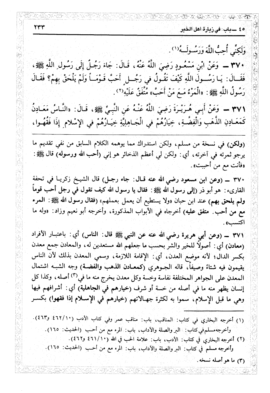 11370 - (وعن ابن مسعود رضي الله عنه قال: جاء رجل) قال الشيخ زكريا في «تحفة القاري» : هو أبو ذرّ (إلى رسول الله - صلى الله عليه وسلم - فقال: يا رسولالله، كيف تقول في رجل أحبّ قوماً ولم يلحق بهم) عند ابن حبان: ولا يستطيع أن يعمل بعملهم (فقال رسول الله: المرء مع من أحبّ. متفق عليه) أخرجاه في الأبواب المذكورة وأخرجه أبو نعيم وزاد «وله ما اكتسب» .