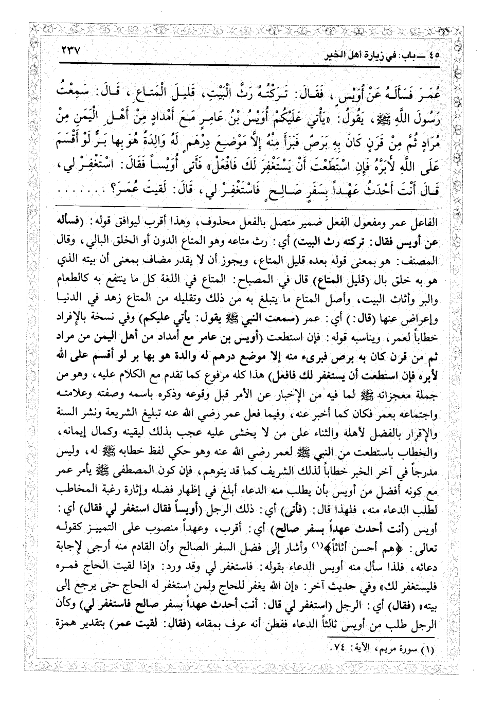فعل عمر الله عنه تبليغ الشريعة ونشر السنة والإقرار بالفضل لأهله، والثناء على من لا يخشى عليه عجب بذلك ليقينه وكمال إيمانه، والخطاب باستطعت من النبي لعمر رضي الله عنه، وهو حكى لفظ خطابه له، وليس مدرجاً في آخر الخبر خطاباً لذلك الشريف كما قد يتوهم، فإن كون المصطفى يأمر عمر مع كونه أفضل من أويس بأن يطلب منه الدعاء أبلغ في إظهار فضله وإثارة رغبة المخاطب لطلب الدعاء منه فلهذا قال (فأتى) أي ذلك الرجل (أويساً فقال استغفر لي، فقال) أي أويس (أنت أحدث عهداً بسفر صالح) أي أقرب، وعهداً منصوب على التمييز كقوله تعالى: