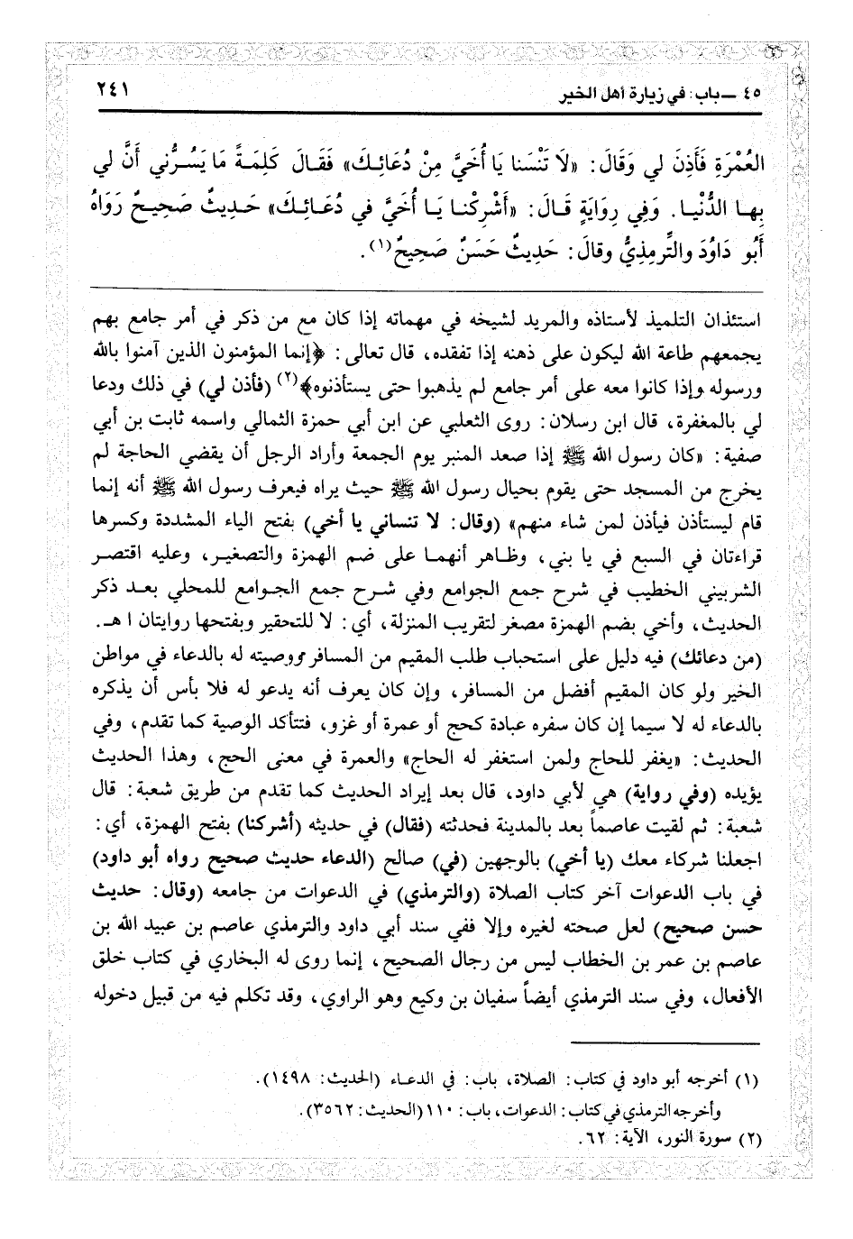استئذان التلميذ لأستاذه، والمريد لشيخه في مهامته إذا كان مع من ذكر في أمر جامع بهم يجمعهم طاعة الله ليكون على ذهنه إذا تفقده، قال تعالى: {إنما المؤمنون الذين آمنوا با ورسوله وإذا كانوا معه على أمر جامع لم يذهبوا حتى يستأذنوه} (النور: 62) (فأذن لي) في ذلك ودعا لي بالمغفرة، قال ابن رسلان: روى الثعلبي عن ابن أبي جمرة الثمالي، واسمه ثابت بن أبي صفية «كان رسول الله - صلى الله عليه وسلم - إذا صعد المنبر يوم الجمعة وأراد الرجل أن يقضي الحاجة لم يخرج من المسجد حتى يقوم بحيال رسول الله - صلى الله عليه وسلم - حيث يراه، فيعرف رسول الله - صلى الله عليه وسلم - أنه إنما قام ليستأذن فيأذن لمن شاء منهم» . (وقال: لا تنسنا يا أخيّ) بفتح الياء المشددة وكسرها قراءتان في السبع في يا بني، وظاهر أنهما على ضم الهمزة والتصغير، وعليه اقتصر الشربيني الخطيب في «شرح جمع الجوامع» ، وفي «شرح جمع الجوامع» للمحلي بعد ذكر الحديث وأخي بضم الهمزة مصغر لتقريب المنزلة: أي لا للتحقير، وبفتحها روايتان اهـ. (من دعائك) فيه دليل على استحباب طلب المقيم من المسافر ووصيته له بالدعاء في مواطن الخير ولو كان المقيم أفضل من المسافر، وإن كان يعرف أنه يدعو له فلا بأس أن يذكره بالدعاء له لا سيما إن كان سفره عبادة كحج أو عمرة أو غزو فتتأكد الوصية كما تقدم، وفي الحديث: «يغفر للحاجّ ولمن استغفر له الحاجّ» والعمرة في معنى الحج، وهذا الحديث يؤيده.
