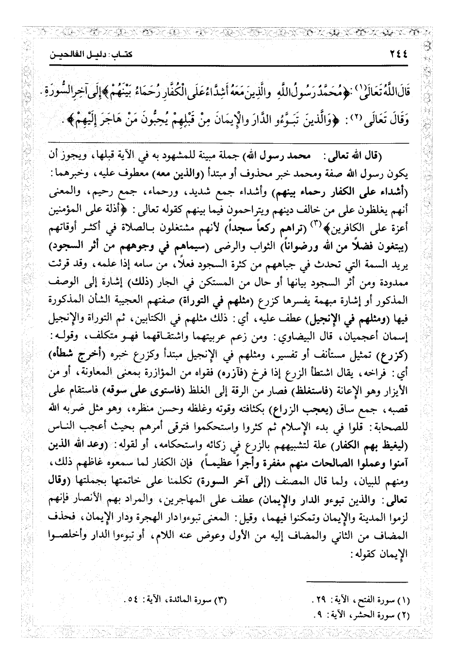 (قال الله تعالى) : ( {محمد رسول الله} ) جملة مبنية للمشهود به في الآية قبلها، ويجوز أن يكون رسول الله صفة ومحمد خبر محذوف أو مبتدأ ( {والذين معه} ) معطوف عليه وخبرهما ( {أشداء على الكفار رحماء بينهم} ) وأشداء جمع شديد ورحماء جمع رحيم، والمعنى: أنهم يغلظون على من خالف دينهم ويتزاحمون فيما بينهم كقوله تعالى: {أذلة على المؤمنين أعزّة على الكافرين} (الحشر: 9) ( {تراهم ركعاً سجداً} ) لأنهم مشتغلون بالصلاة أكثر أوقاتهم ( {يبتغون فضلاً من الله ورضواناً} ) الثواب والرضى ( {سيماهم في وجوههم من أثر السجود} ) يريد السمة التي تحدث في جباهم من كثرة السجود فعلاً، من سامه إذا علمه، وقد قرئت ممدودة، و {من أثر السجود} بيانها، أو حال من المستكن في الجار (ذلك) إشارة إلى الوصف المذكور، أو إشارة مبهمة يفسرها «كزرع» ( {مثلهم في التوراة} ) صفتهم العجيبة الشأن المذكورة فيها ( {ومثلهم في الإنجيل} ) عطف عليه: أي ذلك مثلهم في الكتابين. ثم التوراة والإنجيل اسمان أعجميان. قال البيضاوي: ومن زعم عربيتهما واشتقاقهما فهو متكلف، وقوله ( {كزرع} ) تمثيل مستأنف أو تفسر، ومثلهم في الإنجيل مبتدأ وكزرع خبره ( {أخرج شطأه} ) أي فراخه، يقال اشتطأ الزرع: إذا فرخ ( {فآزره} ) فقواه من المؤازرة بمعنى المعاونة، أو من الإيزار وهو الإعانة ( {فاستغلظ} ) فصار من الرقة إلى الغلظ ( {فاستوى على سوقه} ) فاستقام على قصبه جمع ساق ( {يعجب الزراع} ) بكثافته وقوته وغلظه وحسن منظره، وهو مثل ضربه الله للصحابة قلوا في بدء الإسلام ثم كثروا واستحكموا فترقى أمرهم بحيث أعجب الناس ( {ليغيظ بهم الكفار} ) علة لتشبيهم بالزرع في زكاته واستحكامه، أو لقوله ( {وعد الله الذين آمنوا وعملوا الصالحات منهم مغفرة وأجراً عظيماً} ) فإن الكفار لما سمعوه غاظهم ذلك، ومنهم للبيان. ولما قال المصنف (إلى آخر السورة) تكلمنا على خاتمتها بجملتها.