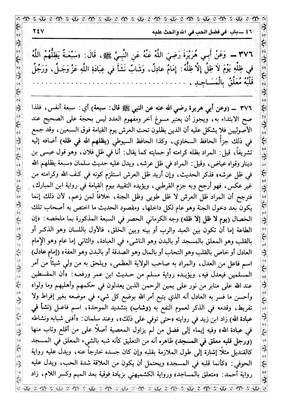 3376 - (وعن أبي هريرة رضي الله عنه عن النبيّ قال: سبعة) أي سبعة أنفس فلذا صح الابتداء به، ويجوز أن يعتبر مسوغ آخر، ومفهوم العدد ليس بحجة على الصحيح عند الأصوليين، فلا يشكل عليه أن الذين يظلون تحت العرش يوم القيامة فوق السبعين، وقد جمع في ذلك جزءاً الحافظ السخاوي وكذا الحافظ السيوطي (يظلهم الله في ظله) أضافه إليه تشريفاً، وقيل المراد بظله كرامته أو حمايته كما يقال: أنا في ظلّ فلان، وهو قول عيسى بن دينار وقواه عياض، وقيل المراد في ظلّ عرشه ويدل عليه حديث سلمان «سبعة بظلهم الله في ظل عرشه» فذكر الحديث، وإن أريد ظل العرش استلزم كونه في كنف الله وكرامته من غير عكس فهو أرجح، وبه جزم القرطبي، ويؤيده التقييد بيوم القيامة في رواية ابن المبارك، فترجح أن المراد ظل العرش لا ظل طوبى وظل الجنة خلافاً لمن زعم لأن ذلك إنما يكون بعد دخول الجنة وهو عام لكل داخلها. ومقصود الحديث ما اختص به أصحاب تلك الخصال (يوم لا ظل إلا ظله) وجه الكرماني الحصر في السبعة المذكورة بما ملخصه: إن الطاعة إما أن تكون بين العبد والربّ أو بينه وبين الخلق، فالأول باللسان وهو الذكر، أو بالقلب وهو المعلق بالمسجد، أو بالبدن وهو الناشىء في العبادة، والثاني إما عام وهو الإمام العادل، أو خاص بالقلب وهو التحاب، أو بالمال وهو الصدقة، أو بالبدن وهو العفة (إمام عادل) اسم فاعل من العدل والمراد به صاحب الولاية العظمى ويلحق به من ولي شيئاً من أمر المسلمين فيعدل فيه ويؤيده رواية مسلم من حديث ابن عمر ورفعه «إن المقسطين عند الله على منابر من نور على