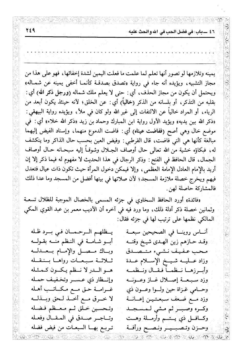 يمينه وتلازمها لو تصوّر أنها تعلم لما علمت ما فعلت اليمين لشدة إخفائها فهو على هذا من مجاز التشبيه، ويؤيده أنه جاء في رواية «تصدق بصدقة كأنما أخفى يمينه عن شماله» ويحتمل أن يكون من مجاز لحذف أي حتى لا يعلم ملك شماله (ورجل ذكر الله تعالى) أي بقلبه من التذكر أو بلسانه من الذكر (خالياً) أي عن الخلق لأنه حينئذٍ يكون أبعد من الرياء. أو المراد خالياً عن الالتفات إلى غير الله ولو كان في ملأ، ويؤيده رواية البيهقي «ذكر الله بين يديه» ويؤيد الأول رواية ابن المبارك وحماد بن زيد «ذكر الله خلاء» أي في موضع خال وهي أصح (ففاضت عيناه) في فاضت الدموع منهما وإسناد الفيض إليهما مبالغة كأنها هي التي فاضت» قال القرطبي: وفيض العين بحسب حال الذاكر وما ينكشف له، فبكاؤه خشية من الله تعالى حال أوصاف الجلال، وشوقاً إليه سبحانه حال أوصاف الجمال. قال الحافظ في «الفتح» وذكر الرجال في هذا الحديث لا مفهوم له فيما ذكر إلا إن أريد بالإمام العادل الإمامة العظمى وإلا فيمكن دخول المرأة حيث تكون ذات عيال فتعدل فيهم ويخرج خصلة ملازمة المسجد لأن صلاتها في بيتها أفضل من المسجد، وما عدا ذلك فالمشاركة حاصلة لهن.