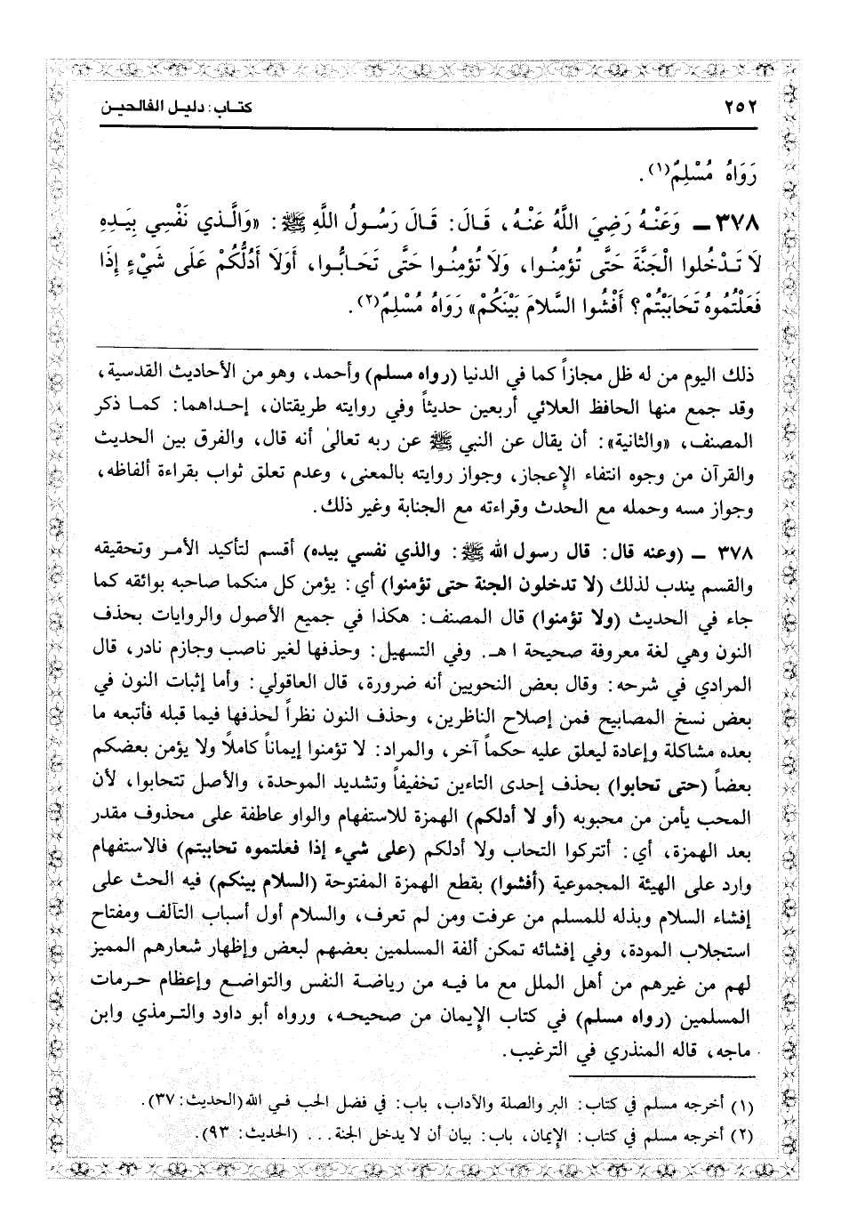 4378 - (وعنه قال: قال رسول الله: والذي نفسي بيده) أقسم لتأكيد الأمر وتحقيقه والقسم يندب لذلك (لا تدخلوا الجنة حتى تؤمنوا) أي ويأمن كل منكم صاحبه بوائقه كما جاء في الحديث (ولا تؤمنوا) قال المصنف: هكذا في جميع الأصول والروايات بحذف النون وهي لغة معروفة صحيحة اهـ. وفي التسهيل وحذفها لغير ناصب وجازم نادر. قال المرادي في «شرحه» وقال بعض النحويين: إنه ضرورة، قال العاقولي: وأما إثبات النون في بعض نسخ «المصابيح» فمن إصلاح الناظرين وحذف النون نظراً لحذفها فيما قبله فأتبعه ما بعده مشاكلة، وأعاده ليعلق عليه حكماً آخر، والمراد لا تؤمنوا إيماناً كاملاً ولا يؤمن بعضكم بعضاً (حتى تحابوا) بحذف إحدى التاءين تخفيفاً وتشديد الموحدة والأصل تتحاببوا لأن المحب يأمن من محبوبه (أو لا أدلكم) الهمزة للاستفهام والواو عاطفة على محذوف مقدر بعد الهمزة. أي أتتركوا التحاب ولا أدلكم (على شي إذا فعلتموه تحاببتم) فالاستفهام وارد على الهيئة المجموعية (أفشوا) بقطع الهمزة المفتوحة (السلام بينكم) فيه الحث على إفشاء السلام وبذله للمسلم «من عرفت ومن لم تعرف» والسلام أول أسباب التآلف ومفتاح استجلاب المودة، وفي إفشائه تمكن ألفة المسلمين بعضم لبعض وإظهار شعارهم المميز لهم من غيرهم من أهل الملل مع ما فيه من رياضة النفس والتواضع وإعظام حرمات المسلمين (رواه مسلم) في كتاب الإيمان من صحيحه، ورواه أبو داود والترمذي وابن ماجه قاله المنذري في الترغيب.