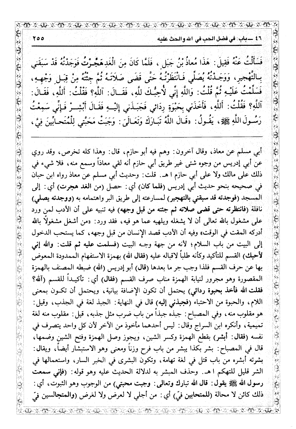 وقال آخرون: وهم فيه أبو حازم، قال: وذا كله تخرّص. وقد روي عن أبي إدريس من وجوه شتى غير طريق أبي حازم أنه لقى معاذاً وسمع منه فلا شيء في ذلك على مالك ولا على أبي حازم اهـ. قلت: وحديث أبي مسلم عن معاذ رواه ابن حبان في صحيحه بنحو حديث أبي إدريس (فلما كان) أي حصل (من الغد هجرت) أي إلى المسجد (فوجدته قد سبقني بالتهجير) لمسارعته إلى طريق البر واهتمامه به (ووجدته يصلي) نافلة (فانتظرته حتى قضى صلاته، ثم جئته من قبل وجهه) فيه تنبيه على أن الأدب لمن ورد على مشغول با تعالى أن لا يشغله ويلهيه عما هو فيه، فقد ورد «من أشغل مشغولاً با أدركه المقت في الوقت» وفيه أن الأدب قصد الإنسان من قبل وجهه كما يستحب الدخول إلى البيت من باب السلام لأنه من جهة وجه البيت (فسلمت عليه ثم قلت: وا إني لأحبك) القسم للتأكيد وكأنه طلباً لإقباله عليه (فقال آ) بهمزة الاستفهام الممدودة المعوض بها عن حرف القسم فلذا وجب جر ما بعدها (قال) أبو إدريس (ا) ضبطه المصنف بالهمزة المقصورة، وهو مجرور لنيابة الهمزة مناب حرف القسم (فقال) أي تأكيداً للقسم (ا، فقلتالله، فأخذ بحبوة ردائي) يحتمل أن تكون الإضافة بيانية، ويحتمل أن تكون بمعنى اللام والحبوة من الاحتباء (فجبذني إليه) قال في «النهاية» : الجبذ لغة في الجذب، وقيل هو مقلوب منه، وفي «المصباح» : جبذه جبذاً من باب ضرب مثل جذبه، قيل مقلوب منه لغة تميمية، وأنكره ابن السراج وقال: ليس أحدهما ماخوذاً من الآخر لأن كل واحد يتصرف في نفسه (فقال أبشر) بقطع الهمزة وكسر الشين، ويجوز وصل الهمزة وفتح الشين وضمها، قال في «المصباح» بشر بكذا يبشر من باب فرح وزناً ومعنى وهو الاستبشار أيضاً. ويقال بشرته أبشره من باب قتل في لغة تهامة، وتكون البشرى في الخبر السار واستعمالها في الشرّ قليل للتهكم اهـ. وحذف المبشر به لدلالة الحديث عليه وهو قوله: (فإني سمعت رسول الله - صلى الله عليه وسلم - يقول: قال الله