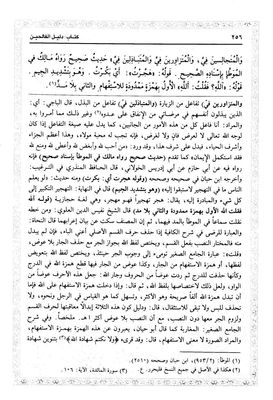 والمتزاورين فيّ) تفاعل من الزيارة (والمتباذلين في) تفاعل من البذل. قال الباجي: أي الذين يبذلون أنفسهم في مرضاتي من الإنفاق على عدوه وغير ذلك مما أمروا به، والمراد أنا فاعل كل هذه الأمور من الجانبين كما يدل عليه صيغة التفاعل إذا كان لوجه الله تعالى لا لعرض فانٍ، ولا لغرض فإنه تجب له محبة مولاه، وهذا أعظم الجزاء وأشرف الحياء فيدل على شرف هذا. وقد ورد «من أحبّ وأبغض وأعطى ومنع فقد استكمل الإيمان» كما تقدم (حديث صحيح رواه مالك في الموطأ بإسناده الصحيح) فإنه رواه فيه عن أبي حازم عن أبي إدريس الخولاني، قال الحافظ المنذري في «الترغيب» : وأخرجه ابن حبان في «صحيحه» وصححه وقوله (هجرت) أي (بكرت) ومنه حديث «لو يعلم الناس ما في التهجير لاستبقوا إليه» (وهو بتشديد الجيم) قال في «النهاية» : التهجير التبكير إلى كل شيء والمبادرة إليه، يقال هجر تهجيراً فهو مهجر، وهي لغة حجازية (قوله آ، فقلت أ، الأول بهمزة ممدودة، والثاني بلا مد) قال الشيخ نفيس الدين العلوي: ومن خطه نقلت سماعاً في «الموطأ» بالمد فيهما، ثم إن المصنف سكت عن بيان إعرابهما. قال النحاة: والعبارة للرضى في «شرح الكافية» : إذا حذف حرف القسم الأصلي أعني الباء فإن لم يبدل منه فالمختار النصب بفعل القسم، ويختص لفظ الله بجواز الجرّ مع حذف الجار بلا عوض. قلت: عبارة «الجامع الصغير» تومىء إلى وجوب الجرّ حينئذٍ ويختص لفظ الله بتعويض لفظها أو همزة الاستفهام من الجار، وكذا عوض من الجار فيها قطع همزة الله في الدرج، وكأنها حذفت للدرج ثم ردت عوضاً من الحروف، وجار الله جعل هذه الأحرف عوضاً من الواو، ولعل ذلك لاختصاصها بلفظالله، ثم قال: وإذا دخلت همزة الاستفهام على الله فإما أن تبدل همزة الله ألفاً صريحة وهو الأكثر وتسهل كما
