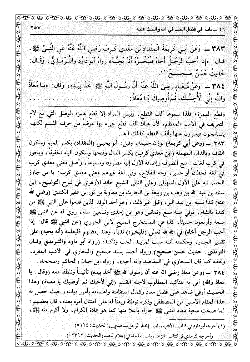 9383 - (وعن أبي كريمة) بوزن حليمة، وقيل أبو يحيى (المقداد) بكسر الميم وسكون القاف وبالدال المهملة (ابن معدي يكرب) بكسر الدال وفتحها وسكون الباء تخفيفاً، ويجوز في كرب لغات مع الصرف وإضافة الأول إليه مصروفاً وممنوعاً، وأصل معنى معدي كرب في لغة قحطان أو حمير: وجه الفلاح، وفي لغة غيرهم معنى معدي يكرب: يا من جاوز الحد، نبه على الأول السهيلي، وعلى الثاني الشيخ خالد الأزهري في «شرح التوضيح» ، ابن سناد بن عبد الله بن وهب بن ربيعة بن الحارث بن معاوية بن ثور بن عفير الكندي (رضي الله عنه) كذا نسبه ابن عبد البرّ، وقيل غير ذلك، وهو أحد الوفد الذين قدموا على النبيّ من كندة بالشام، توفي سنة سبع وثمانين وهو ابن إحدى وتسعين سنة، روى له عن النبيّ سبعة وأربعون حديثاً، كذا في «المستخرج» المليح لابن الجزري (عن النبيّ: إذا أحبّ الرجل أخاه) في الله - صلى الله عليه وسلم - تعالى (فليخبره) ندباً، وعند بعضهم فليعلمه (أنه يحبه) على تقدير الجار. وحكمته أنه سبب لمزيد الحبّ وتأكده (رواه أبو داود والترمذي وقال) الترمذي: (حديث حسن صحيح) ورواه أحمد بسند صحيح والبخاري في «الأدب المفرد» ولفظه كما قال السخاوي في «المقاصد» أنه أحبه، ورواه ابن حبان والحاكم وصححاه.