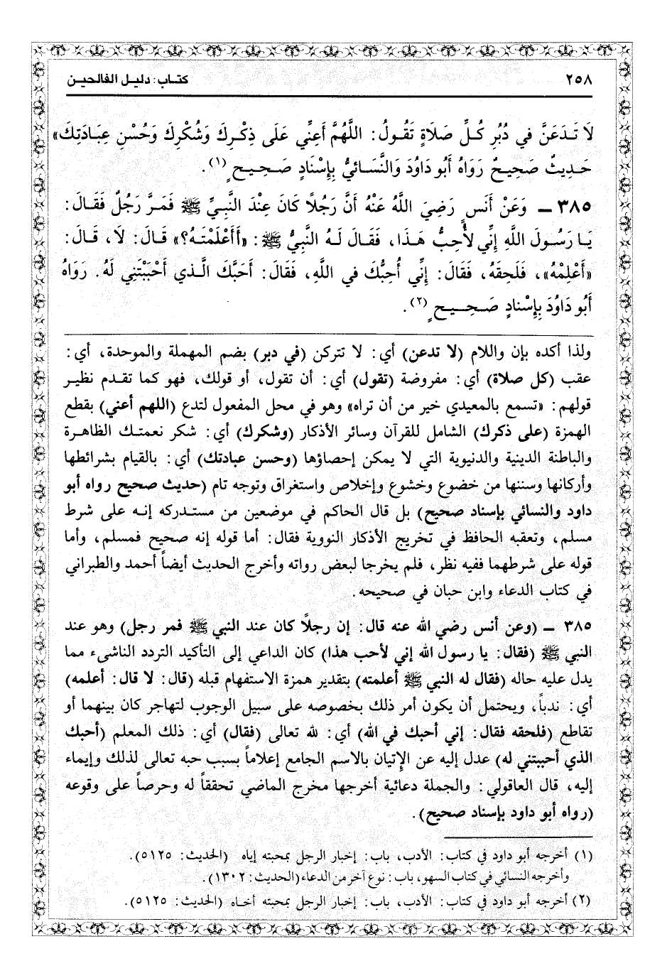 ولذا أكده بإن واللام (لا تدعن) أي لا تتركن (في دبر) بضم المهملة والموحدة: أي عقب (كل صلاة) أي مفروضة (تقول) أي أن تقول، أو قولك فهو كما تقدم نظير قولهم: «تسمع بالمعيدي خير من أن تراه» ، وهو في محل المفعول لتدع (اللهم أعني) بقطع الهمزة (على ذكرك) الشامل للقرآن وسائر الأذكار (وشكرك) أي شكر نعمتك الظاهرة والباطنة، الدينية والدنيوية التي لا يمكن إحصاؤها (وحسن عبادتك) أي بالقيام بشرائطها وأركانها وسننها من خضوع وخشوع وإخلاص واستغراق وتوجه تام (حديث صحيح، رواه أبو داود والسنائي بإسناد صحيح) بل قال الحاكم في موضعين من «مستدركه» : إنه على شرط مسلم، وتعقبه الحافظ في تخريج الأذكار النووية فقال: أما قوله إنه صحيح فمسلم، وأما قوله على شرطهما ففيه نظر فلم يخرجا لبعض رواته وأخرج الحديث أيضاً أحمد والطبراني في كتاب الدعاء وابن حبان في «صحيحه» .