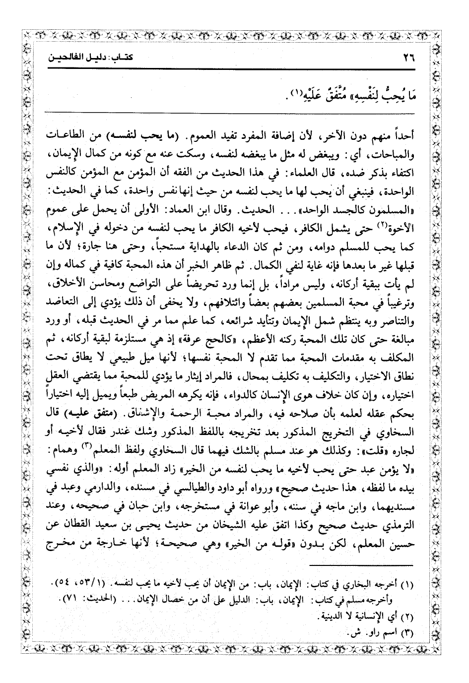 أحداً منهم دون الآخر لأن إضافة المفرد تفيد العموم (ما يحبّ لنفسه) من الطاعات والمباحات أي ويبغض له مثل ما يبغضه لنفسه وسكت عنه مع كونه من كمال الإيمان اكتفاء بذكر ضده. قال العلماء في هذا الحديث من الفقه: أن المؤمن مع المؤمن كالنفس الواحدة، فينبغي أن يحبّ لها ما يحبّ لنفسه من حيث إنها نفس واحدة كما في الحديث «المسلمون كالجسد الواحد» الحديث.