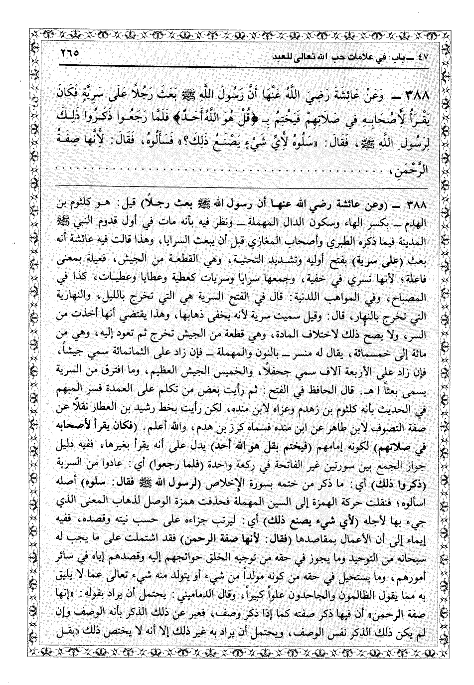 3388 - (وعن عائشة رضي الله عنها أن رسول الله - صلى الله عليه وسلم - بعث رجلاً) قيل هو كلثوم بن الهدم بكسر الهاء وسكون الدال المهملة، وفيه نظر بأنه مات في أول قدوم النبي المدينة فيما ذكره الطبري وأصحاب المغازي قبل أن يبعث السرايا، وهذا قالت فيه عائشة إنه بعث (على سرية) بفتح أوله وتشديد التحتية، وهي القطعة من الجيش فعليه بمعنى فاعلة لأنها تسري في خفية وجمعها سرايا وسريات كعطية وعطايا وعطيات كذا في «المصباح» ، وفي «المواهب اللدنية» قال في «الفتح» : السرية التي تخرج بالليل، والنهارية التي تخرج بالنهار، قال: وقيل سميت سرية لأنه يخفى ذهابها، وهذا يقتضي أنها من السرّ ولا يصح ذلك لاختلاف المادة، وهي قطعة من الجيش تخرج ثم تعود إليه وهي من مائة إلى خمسمائة، يقال له منسر بالنون والمهملة، فإن زاد على الثمانمائة سمي جيشاً، فإن زاد على الأربعة آلاف سمي جحفلاً، والخميس الجيش العظيم وما افترق من السرية يسمى بعثاً اهـ. قال الحافظ في «الفتح» : ثم رأيت بعض من تكلم على العمدة فسر المبهم في الحديث بأنه كلثوم بن زهدم، وعزاه لابن منده، لكن رأيت بخط رشيد بن العطار نقلاً عن صفة التصوّف لابن طاهر عن ابن منده فسماه كرز بن هدم والله أعلم (فكان يقرأ لأصحابه في صلاتهم) لكونه إمامهم (فيختم بقل هو الله أحد) يدل على أنه يقرأ بغيرها، ففيه دليل جواز الجمع بين سورتين غير الفاتحة في ركعة واحدة (فلما رجعوا) أي عادوا من السرية (ذكروا ذلك) أي ما ذكر من ختمه بسورة الإخلاص (لرسول الله - صلى الله عليه وسلم ـ