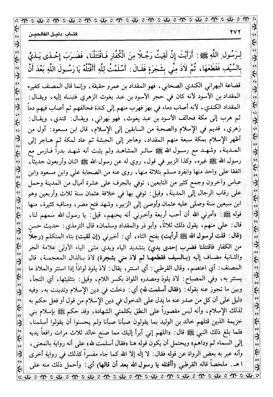قال الترمذي: حديث حسن (قال: قلت لرسول الله: أرأيت) بفتح التاء أي أخبرني (إن لقيت) بتاء المتكلم (رجلاً من الكفار فاقتتلنا فضرب إحدى يدي) بتشديد الياء ويدي مثنى الياء الأولى علامة الجر والثانية مضاف إليه (بالسيف فقطعها ثم لاذ مني بشجرة) لاذ بالذال المعجمة قال المصنف أي اعتصم وقال القرطبي أي استتر يقال لاذ يلوذ لواذاً إذا استتر. والملاذ: ما يستتر به وفي «المصباح» لاذ يلوذ ومصدره اللواذ بكسر اللام وقيل بتثليثها: أي التجأ، وبين ما تجوز عنه بقوله (فقال أسلمت) أي دخلت في الإسلام وتدينت به. وفيه دليل على أن كل من صدر عنه ما يدل على الدخول في دين الإسلام من قول أو فعل حكم له لذلك بالإسلام، وأنه لي مقصوراً على النطق بكلمتي الشهادة، وقد حكم بإسلام بني خزيمة الذين قتلهم خالد بن الوليد بما يقولون صبأنا صبأنا ولم يحسنوا أن يقولوا أسلمنا، فلما بلغ ذلك النبي قال: «اللهم إني أبرأ إليك مما صنع خالد ثلاث مرات رافعاً يديه إلى السماء ثم وداهم» ويحتمل أن يكون قوله هنا «فقال أسلمت» على أنه رواية بالمعنى، وأنه عبر به بعض الرواة عن قوله فقال لا إله إلا الله كما جاء مفسراً كذلك في رواية أخرى اهـ. ملخصاً، قاله القرطبي (أأقتله يا رسول الله بعد أن قالها) أي وأحمل ذلك منه على