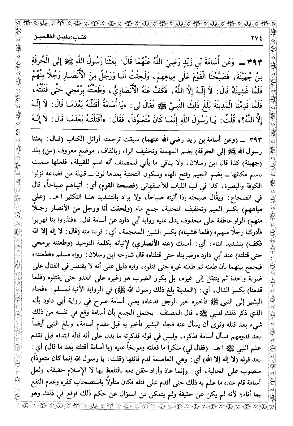 4393 - (وعن أسامة بن زيد رضي الله عنهما) سبقت ترجمته أوائل الكتاب (قال: بعثنا رسول الله - صلى الله عليه وسلم - إلى الحرقة) بضم المهملة وتخفيف الراء وبالقاف: موضع معروف (من) بلد (جهينة) كذا قال ابن رسلان، ولا ينافي ما يأتي للمصنف أنه اسم للقبيلة فلعلها سميت باسم مكانها بضم الجيم وفتح الهاء وسكون التحتية: بعدها نون: قبيلة من قضاعة نزلوا الكوفة والبصرة كذا في «لب اللباب» للأصبهاني (فصبحنا القوم) أي أتيناهم صباحاً، قال في «الصحاح» : ويقال صبحته: إذا أتيته صباحاً ولا يراد بالتشديد هنا التكثير اهـ. (على مياههم) بكسر الميم وتخفيف التحتية جمع ماء (ولحقت أنا ورجل من الأنصار رجلاً منهم) الواو عاطفة على محذوف يدل عليه رواية أبي داود عن أسامة قال «فنذروا بنا فهربوا فأدركنا رجلاً منهم» (فلما غشيناه) بكسر الشين المعجمة أي قربنا منه (قال: لا إله إلا الله فكف) بتشديد الفاء أي أمسك (عنه الأنصاري) لإتيانه بكلمة التوحيد (وطعنته برمحي حتى قتلته) عند أبي داود «ضوربناه حتى قتلناه» قال شارحه ابن رسلان: رواه مسلم «فطعنته» فيجمع بينهما أن طعنه ثم طعنه غيره حتى قتلوه. وفيه دليل على أنه لا يقتصر في القتال على ضربة واحدة ثم ينتقل إلى غيره بل يكرر الضرب هو وغيره على العدو حتى يقتلوه (فلما قدمنا) بكسر الدال، أي (المدينة بلغ ذلك النبي) في الرواية الآتية لمسلم «فجاء البشير إلى النبي فأخبره خبر الرجل فدعاه» يعني أسامة صرح في رواية أبي داود بأنه الذي ذكر ذلك للنبي، قال المصنف: يحتمل الجمع بأن أسامة وقع في نفسه من ذلك شيء بعد قتله ونوى أن يسأل عنه، فجاء البشير فأخبر به قبل مقدم أسامة، وبلغ النبي أيضاً بعد قدومهم فسأل أسامة فذكره، وليس في قوله فذكرته ما يدل على أنه قاله ابتداء قبل تقدم علم النبي اهـ.c (فقال لي) منكراً ما فعلته وموبخاً عليه (يا أسامة أقتلته بعد ما قال) أي بعد قوله (لا إله إلا ا) أي وهي العاصمة