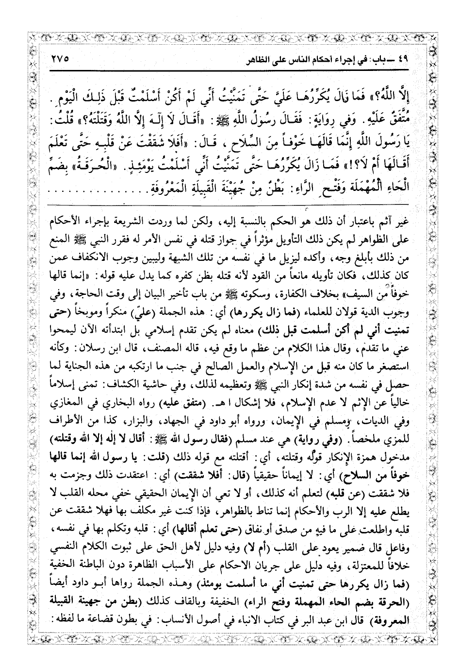 غير آثم باعتبار أن ذلك هو الحكم بالنسبة إليه، ولكن لما وردت الشريعة بإجراء الأحكام على الظواهر لم يكن ذلك التأويل مؤثراً في جواز قتله في نفس الأمر له فقرّر النبيّ المنع من ذلك بأبلغ وجه وآكده ليزيل ما في نفسه من تلك الشبهة وليبين وجوب الانكفاف عمن كان كذلك فكان تأويله مانعاً من القود لأنه قتله بظن كفره كما يدل عليه قوله «إنما قالها خوفاً من السيف» بخلاف الكفارة، وسكوته من باب تأخير البيان إلى وقت الحاجة وفي وجوب الدية قولان للعلماء (فما زال يكرّرها) أي هذه الجملة (على) منكراً وموبخاً (حتى تمنيت أنى لم أكن أسلمت قبل ذلك) معناه لم يكن تقدم إسلامي بل ابتدأته الآن ليمحو عني ما تقدم، وقال: هذا الكلام من عظم ما وقع فيه قاله المصنف. قال ابن رسلان: وكأنه استصغر ما كان منه قبل من الإسلام والعلم الصالح في جنب ما ارتكبه من هذه الجناية لما حصل في نفسه من شدة إنكار النبي وتعظيمه لذلك، وفي حاشية الكشاف تمنى إسلاماً خالياً عن الإثم لا عدم الإسلام فلا إشكال اهـ. (متفق عليه) رواه البخاري في المغازي وفي الديات ومسلم في الإيمان، ورواه، أبو داود في الجهاد والبزار كذا من «الأطراف» للمزي ملخصاً (وفي رواية) هي عند مسلم (فقال رسول الله: أقال لا إله إلا الله وقتلته؟) مدخول همزة الإنكار قوله وقتلته: أي أقتلته مع قوله ذلك (قلت: يا رسول الله إنما قالها خوفاً من السلاح) أي لا إيماناً حقيقياً (قال أفلا شققت) أي اعتقدت ذلك وجزمت به فلا شققت (عن قلبه) لتعلم أنه كذلك أولاً تعي أن الإيمان الحقيقي خفي، محله القلب لا