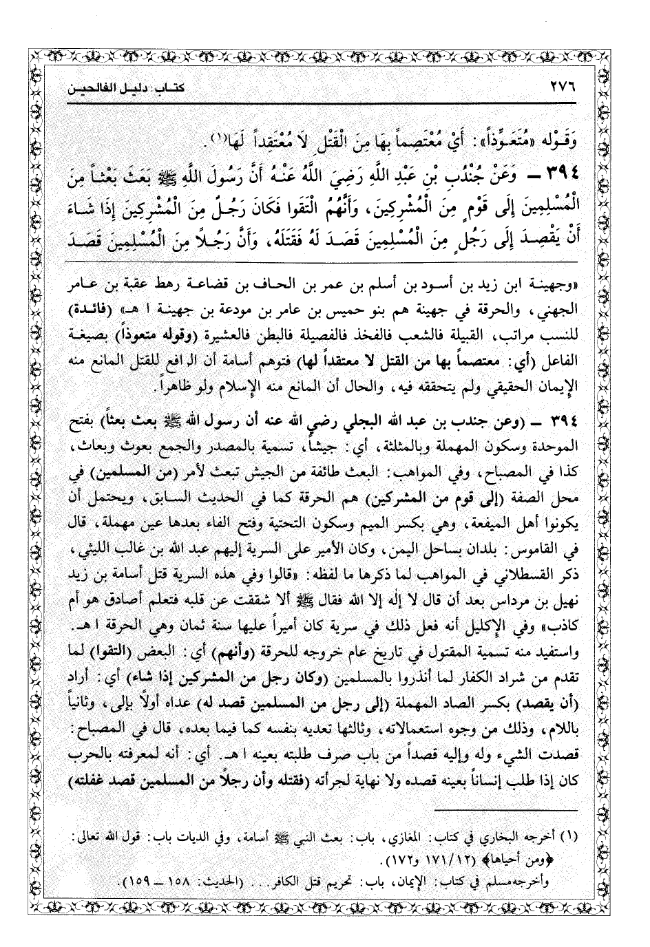 5394 - (وعن جندب بن عبد ا) البجلي (رضي الله عنه أن رسول الله - صلى الله عليه وسلم - بعث بعثاً) بفتح الموحدة وسكون المهملة وبالمثلثة، أي جيشاً تسمية بالمصدر والجمع بعوث وبعاث كذا في «المصباح» : وفي «المواهب» البعث طائفة من الجيش تبعث لأمر (من المسلمين) في محل الصفة (إلى قوم من المشركين) هم الحرقة كما في الحديث السابق، ويحتمل أن يكونوا أهل الميفعة، وهي بكسر الميم وسكون التحتية وفتح الفاء بعدها عين مهملة. قال في «القاموس» بلدان بساحل اليمن، وكان الأمير على السرية إليهم عبد الله ابن غالب الليثي ذكر القسطلاني في «المواهب» لما ذكرها ما لفظه «قالوا: وفي هذه السرية قتل أسامة بن زيد نهيل بن مرداس بعد أن قال لا إله إلاالله، فقال: ألا شققت عن قلبه فتعلم أصادق هو أم كاذب» وفي «الإكليل» أنه فعل ذلك في سرية كان أميراً عليها سنة ثمان وهي الحرقة اهـ. واستفيد منه تسمية المقتول في تاريخ عام خروجه للحرقة (وأنهم) أي البعض (التقوا) لما تقدم من شراد الكفار لما أنذروا بالمسلمين (وكان رجل من المشركين إذا شاء) أي أراد (أن يقصد) بكسر الصاد المهملة (إلى رجل من المسلمين قصد له) عداه أولاً «بإلى» وثانياً بـ «اللام» وذلك من وجوه استعمالاته، وثالثها تعديه بنفسه كما فيما بعد. قال في «المصباح» : قصدت الشيء وله وإليه قصداً من باب صرف: طلبته بعينه اهـ: أي إنه لمعرفه بالحرب كان إذا طلب إنساناً بعينه قصده ولا نهاية لجرأته (فقتله وأن رجلاً من المسلمين قصد غفلته)