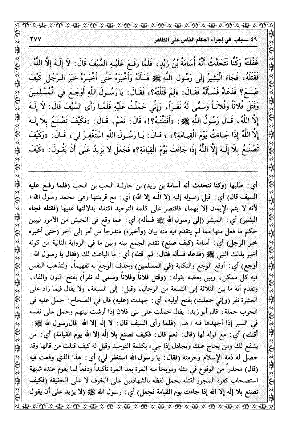 مما لم يتقدم فيه منه بيان (وأخبره) متدرجاً من أمر إلى آخر (حتى أخبره خبر الرجل) أي أسامة (كيف صنع) تقدم الجمع بينه وبين ما في الرواية الثانية ومن كونه أخبر بذلك النبي (فدعاه فسأله فقال: لم قتلته) أي ما الباعث لك (فقال: يا رسول الله أوجع) أي أوقع الوجع والنكاية (في المسلمين) وحذف الوجع به تفهيماً ولتذهب النفس فيه كل ممكن وبين بعضه بقوله (وقتل فلاناً وفلاناً وسمى له نفراً) بفتح النون والفاء، وتقدم أنه ما بين الثلاثة إلى التسعة من الرجال وقيل إلى السبعة، ولا يقال فيما زاد على العشرة نفر (وإني حملت) بفتح أوليه أي جهدت (عليه) قال في «الصحاح» حمل عليه في الحرب حملة. قال أبو زيد: يقال حملت على بني فلان إذا أرّشت بينهم، وحمل على نفسه في السير إذا أجهدها فيه اهـ (فلما رأى السيف قال: لا إله إلاالله، قال رسول الله: أقتلته) أي مع قوله (قال: نعم، قال فكيف تصنع بلا إله إلا الله يوم القيامة؟) أي من يشفع لك ومن يحاج عنك ويجادل إذا جيء بكلمة التوحيد، وقيل له: كيف قتلت من قالها وقد حصل له ذمة الإسلام وحرمته (فقال: يا رسول الله استغفرلي) أي هذا الذي وقعت فيه (قال) محذراً من الوقوع في مثله وموبخاً منه المرة بعد المرة تأكيداً ودفعاً لما يقوم عنده شبهة استصحاب كفره المجوز لقتله بحمل لفظه بالشهادتين على الخوف لا على الحقيقة (فكيف تصنع بلا إله إلا الله إذا جاءت يوم القيامة فجعل) أي رسول الله - صلى الله عليه وسلم - (لا يزيد على أن يقول