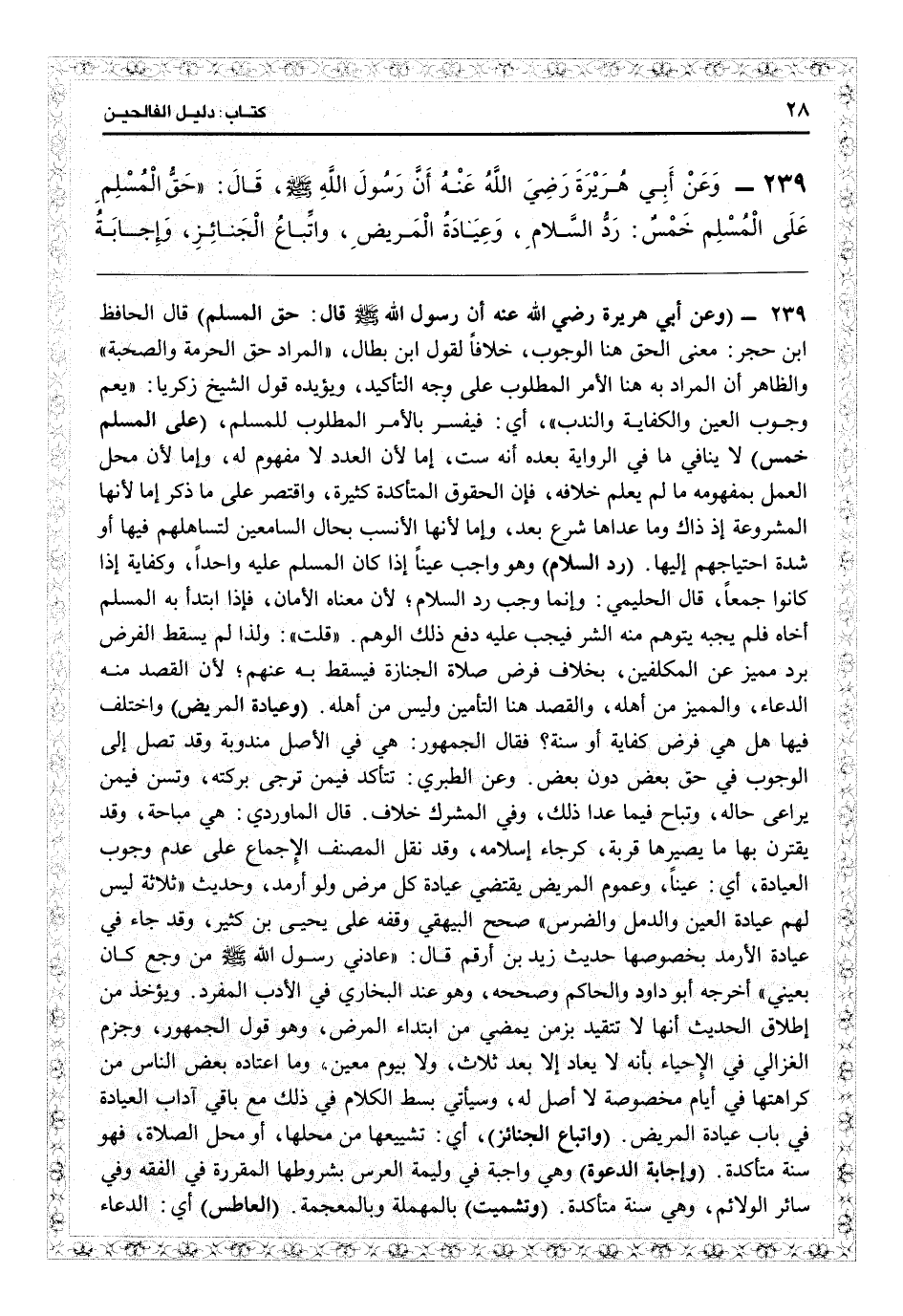23817 - (وعن أبي هريرة رضي الله عنه أن رسول الله - صلى الله عليه وسلم - قال: حق المسلم) قال الحافظ ابن حجر معنى الحق هنا الوجوب خلافاً لقول ابن بطال: المراد حق الحرمة والصحبة والظاهر أن المراد به هنا الأمر المطلوب على وجه التأكيد، ويؤيده قول الشيخ زكريا يعم وجوب العين والكفاية والندب أي فيفسر بالأمر المطلوب للمسلم (على المسلم خمس) لا ينافي ما في رواية بعده أنه ست إما لأن العدد لا مفهوم له وإما لأن محل العمل بمفهومه ما لم يعلم خلافه فإن الحقوق المتأكدة كثيرة واقتصر على ما ذكر إما لأنها المشروعة إذ ذاك وما عداها شرع بعد وإما لأنها الأنسب بحال السامعين بتساهلهم فيها أو شدة احتياجهم إليها (رد السلام) وهوواجب عيناً إذا كان المسلم عليه واحداً وكفاية إذا كانوا جمعاً قال الحليمي: وإنما وجب رد السلام لأن معناه الأمان فإذا ابتدأ به المسلم أخاه فلم يجبه يتوهم منه الشر فيجب عليه دفع ذلك الوهم. قلت: ولذا لم يسقط الفرض برد مميز عن المكلفين بخلاف فرض صلاة الجنازة فيسقط به عنهم لأن القصد منه الدعاء والمميز من أهله، والقصد هنا التأمين وليس من أهله (وعيادة المريض) واختلف فيها هل هي فرض كفاية أو سنة: فقال الجمهور هي في الأصل مندوبة وقد تصل إلى الوجوب في حق بعض دون بعض.