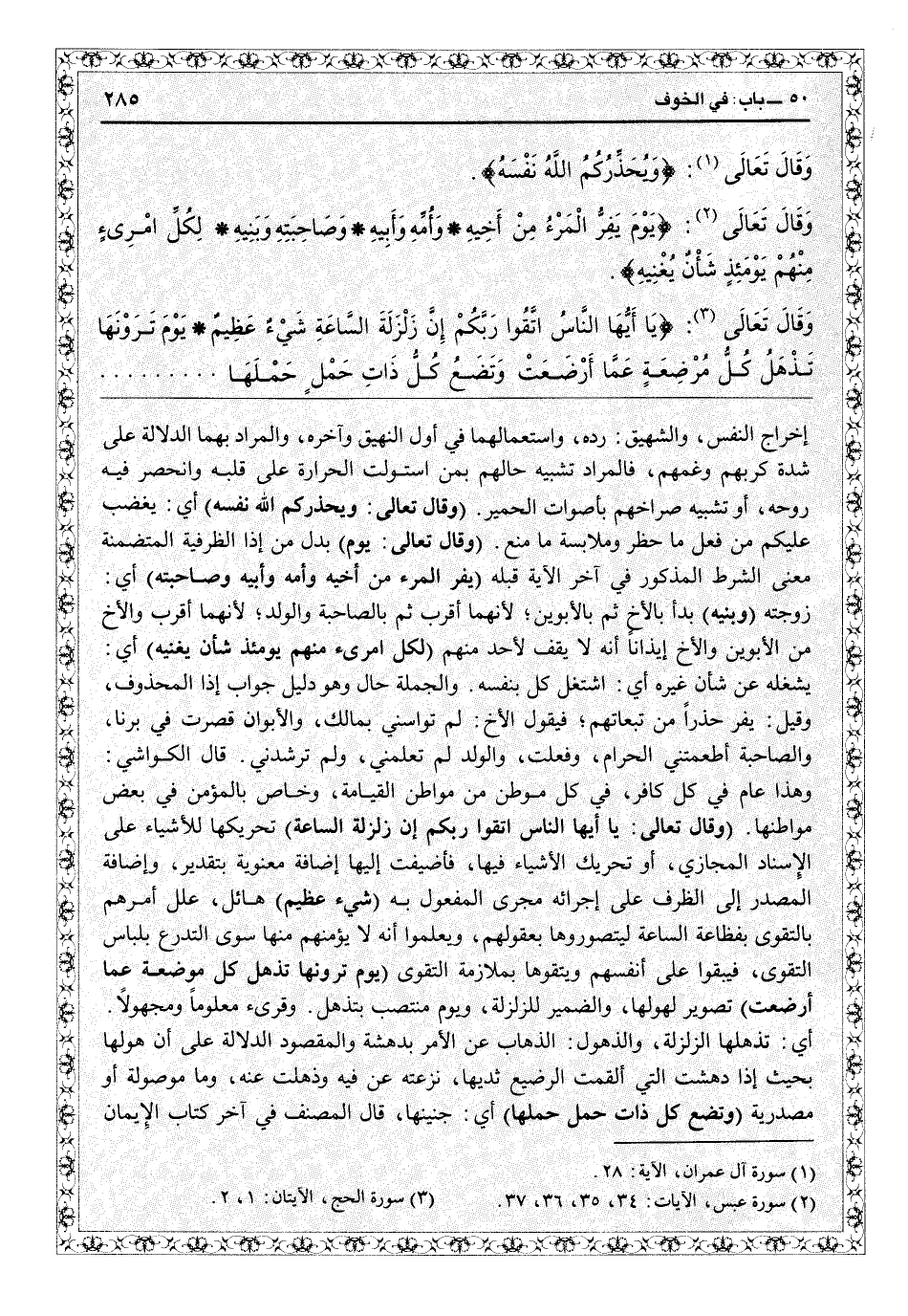 (وقال تعالى) : {يوم} ) بدل من إذا الظرفية المتضمنة معنى الشرط المذكور في آخر الآية قبله ( {يفرّ المرء من أخيه وأمه وأبيه وصاحبته} ) أي زوجته ( {وبنيه} ) بدأ بالأخ ثم بالأبوين لأنهما أقرب ثم بالصاحبة والولد لأنهما أقرب والأخ من الأبوين والأخ إيذاناً أنه لا يقف لأحد منهم ( {لكل امرىء منهم يومئذٍ شأن يغنيه} ) أي يشغله عن شأن غيره: أي اشتغل كل بنفسه والجملة حال وهو دليل جواب إذا المحذوف، وقيل يفرّ حذراً من تبعاتهم، فيقول الأخ لم تواسني بمالك. والأبوان قصرت في برنا، والصاحبة أطعمتني الحرام وفعلت، والولد لم تعلمني ولم ترشدني. قال الكواشي: وهذا عام في كل كافر في كل موطن من مواطن القيامة وخاص بالمؤمن في بعض مواطنها.