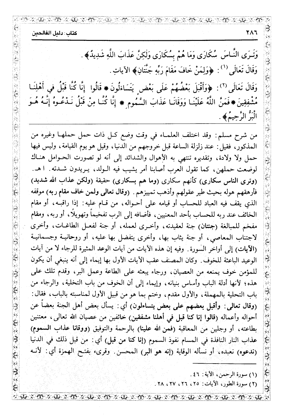 (وقال تعالى) : {ولمن خاف مقام ربه} ) موقفه الذي يقف فيه العباد للحساب. أو قيامه على أحواله من قام عليه إذا راقبه. أو مقام الخائف عند ربه للحساب بأحد المعنيين فأضافه إلى الربّ تفخيماً وتهويلاً ربه، ومقام مفخم للمبالغة ( {جنتان} ) جنة لعقيدته وأخرى لعمله، أو جنة لفعل الطاعات وأخرى لاجتناب المعاصي، أو جنة يثاب بها، وأخرى يتفضل بها عليه أو روحانية وجسمانية (الآيات) إلى أواخر السورة. وفيه أن هذه الآيات من آيات الوعد المثيرة للرجاء لا من آيات الوعيد الباعثة للخوف وكأن المصنف عقَّب الآيات الأول بها إيماء إلى أنه ينبغي أن يكون للمؤمن خوف يمنعه من العصيان ورجاء يبعثه على الطاعة وعمل البرّ، وقدم تلك على هذه لأنها أدلة الباب وأساس بنيانه، وإيماء إلى أن الخوف من باب التخلية، والرجاء من باب التحلية، بالمهملة والأول مقدم، وختم بما هو من قبيل الأول لمناسبته بالباب فقال:
