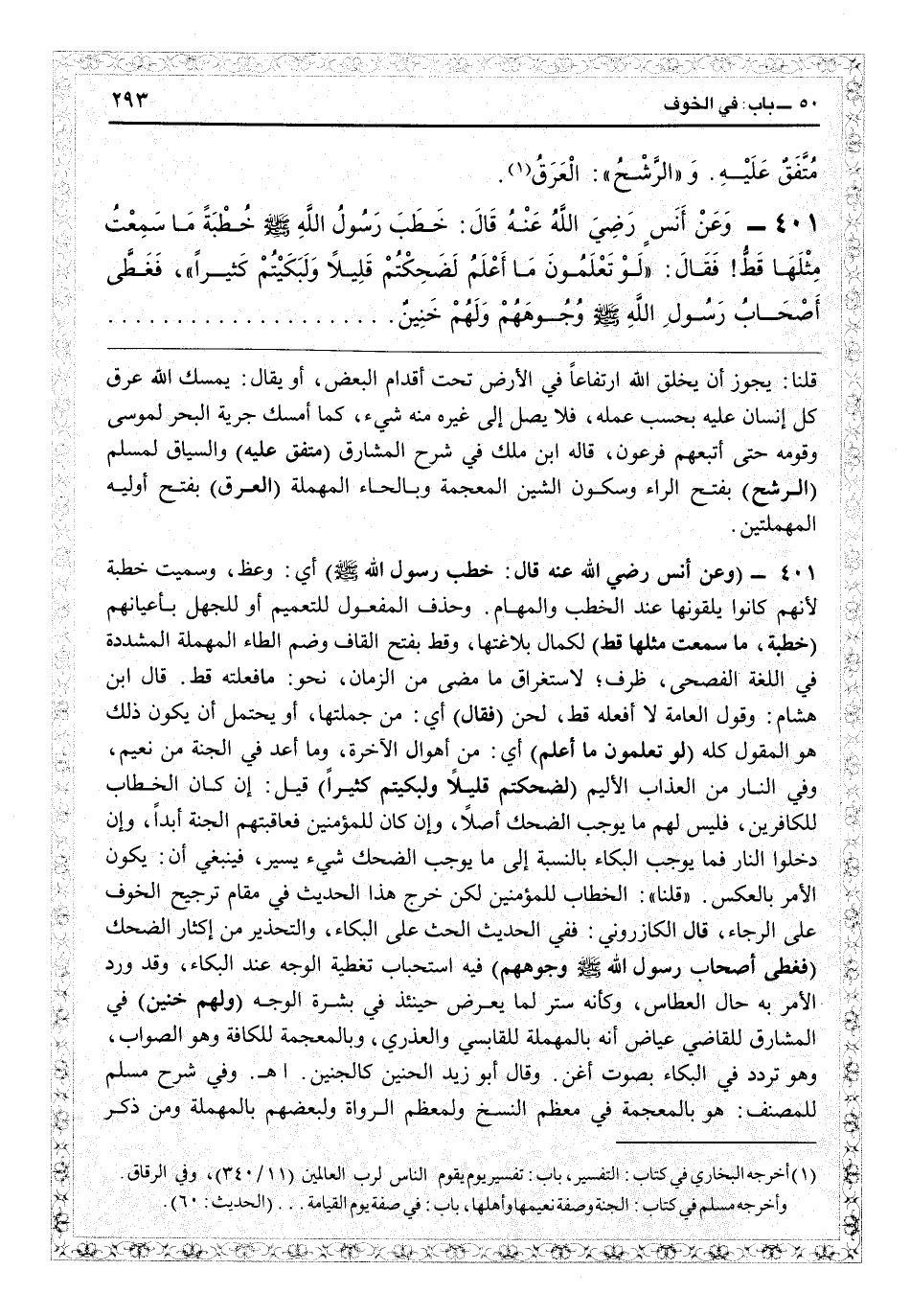 قلنا: يجوز أن يخلق الله ارتفاعاً في الأرض تحت أقدام البعض، أو يقال يمسك الله عرق كل إنسان عليه بحسب عمله فلا يصل إلى غيره منه شيء كما أمسك جرية البحر لموسى وقومه حتى أتبعهم فرعون، قاله ابن ملك في «شرح المشارق» (متفق عليه) والسياق لمسلم (والرشح) بفتح الراء وسكون الشين المعجمة وبالحاء المهملة (العرق) بفتح أوليه المهملتين.