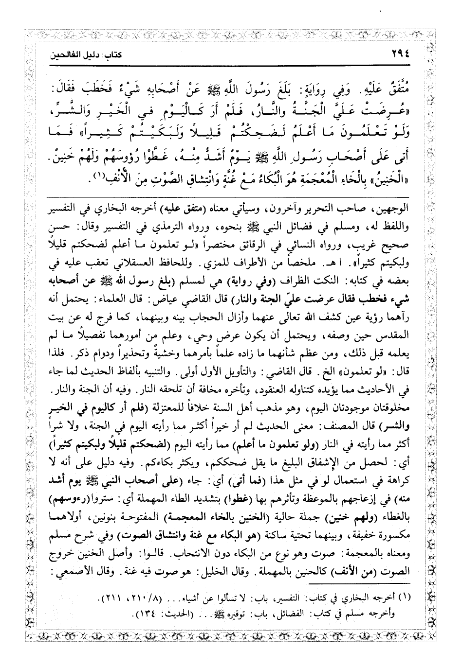 هي لمسلم ( «بلغ رسول الله - صلى الله عليه وسلم - عن أصحابه شيء فخطب فقال: عرضت عليّ الجنة والنار) قال القاضي عياض: قال العلماء: يحتمل أنه رآهما رؤية عين كشف الله تعالى عنهما وأزال الحجاب بينه وبينهما كما خرج له عن بيت المقدس حين وصفه، ويحتمل أن يكون عرض وحي، وعلم من أمورهما تفصيلاً ما لم يعلمه قبل ذلك ومن عظم شأنهما ما زاده علماً بأمرهما وخشية وتحذيراً ودوام ذكر فلذا قال: لو تعلمون الخ. قال القاضي: والتأويل الأول أولى والتنبيه بألفاظ الحديث لما جاء في الأحاديث مما يؤيده كتناوله العنقود وتأخره مخافة أن تلحقه النار. وفيه أن الجنة والنار مخلوقتان موجودتان اليوم وهو مذهب أهل السنة خلافاً للمعتزلة (فلم أر كاليوم في الخير والشر) قال المصنف: معنى الحديث لم أر خيراً أكثر مما رأيته اليوم في الجنة، ولا شرّاً أكثر مما رأيته في النار (ولو تعلمون ما أعلم) مما رأيته اليوم (لضحكتم قليلاً ولبكيتم كثيراً) أي لحصل من الإشفاق البليغ ما يقلّ ضحككم ويكثر بكاءكم. وفيه دليل على أنه لا كراهية في استعمال «لو» في مثل هذا (فما أتى) أي جاء (على أصحاب النبيّ يوم أشد منه) في إزعاجهم بالموعظة وتأثرهم بها (غطوا) بتشديد الطاء المهملة أي ستروا (رءوسهم) بالغطاء (ولهم خنين» ) جملة حالية (الخنين بالخاء المعجمة) المفتوحة وبنونين أولاهما مكسورة خفيفة وبينهما تحتية ساكنة (هو البكاء مع غنة وانتشاق الصوت) وفي «شرح مسلم» : ومعناه بالمعجمة صوت وهو نوع من البكاء دون الانتحاب. قالوا: وأصل الخنين خروج الصوت (من الأنف) كالحنين بالمهملة. وقال الخليل: هو صوت فيه غنة. وقال الأصمعي: