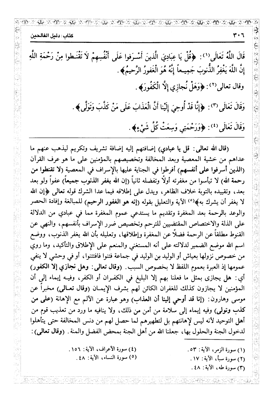 (قال الله تعالى) : {قل يا عبادي} ) إضافتهم إليه إضافة تشريف وتكريم ليذهب عنهم ما عداهم من خشية المعصية وبعد المخالفة، وتخصيصهم بالمؤمنين على ما هو عرف القرآن ( {الذين أسرفوا على أنفسهم} ) أفرطوا في الجناية عليها بالإسراف في المعصية ( {لا تقنطوا من رحمة ا} ) لا تيأسوا من مغفرته أوّلاً وتفضله ثانياً ( {إن الله يغفر الذنوب جميعاً} ) عفوا ولو بعد بعدا وتقييده بالتوبة خلاف الظاهر، ويدل على إطلاقه فيما عدا الشرك قوله تعالى: {إن الله لا يغفر أن يشرك به} (النساء: 48) الآية والتعليل بقوله ( {إنه هو الغفور الرحيم} ) للمبالغة وإفادة الحصر والوعد بالرحمة بعد المغفرة وتقديم ما يستدعي عموم المغفرة مما في عبادي من الدلالة على الذلة والاختصاص المقتضين للترحم وتخصيص ضرر الإسراف بأنفسهم، والنهي عن القنوط مطلقاً عن الرحمة فضلاً عن المغفرة وإطلاقها وتعليله بأن الله يغفر الذنوب، ووضع اسم الله موضع الضمير لدلالته على أنه المستغني والمنعم على الإطلاق والتأكيد، وما روي من خصوص نزولها بعياش أو الوليد بن الوليد بن جماعة فتنوا فافتتنوا، أو في وحشي لا ينفي عمومها إذ العبرة بعموم اللفظ لا بخصوص السبب.