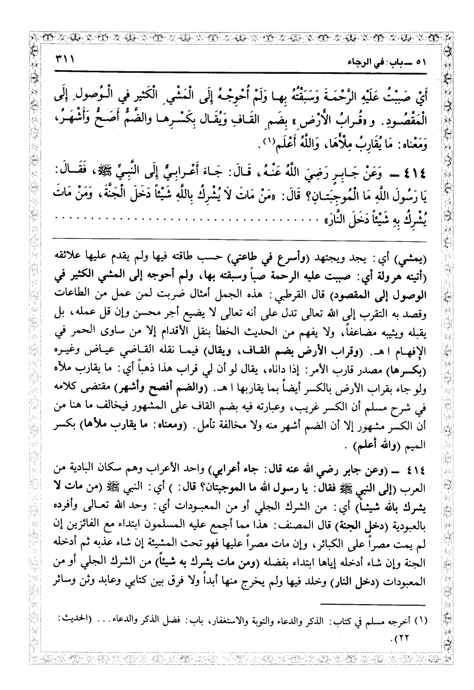 3414 - (وعن جابر رضي الله عنه قال: جاء أعرابي) واحد الأعراب وهم سكان البادية من العرب (إلى النبي فقال: يا رسول الله: ما الموجبتان؟ قال) أي النبي (من مات لا يشرك با شيئاً) أي من الشرك الجلي أو من المعبودات: أي وحد الله تعالى وأفرده بالعبودية (دخل الجنة) قال المصنف: هذا مما أجمع عليه المسلمون ابتداءً مع الفائزين إن لم يمت مصرّاً على الكبائر، وإن مات مصرّا عليها فهو تحت المشيئة إن شاء عذبه ثم أدخله الجنة» وإن شاء أدخله إياها ابتداءً بفضله (ومن مات يشرك به شيئاً) من الشرك الجليّ أو من المعبودات (دخل النار) وخلد فيها ولم يخرج منها أبداً لا فرق بين كتابي وعابد وثن وسائر