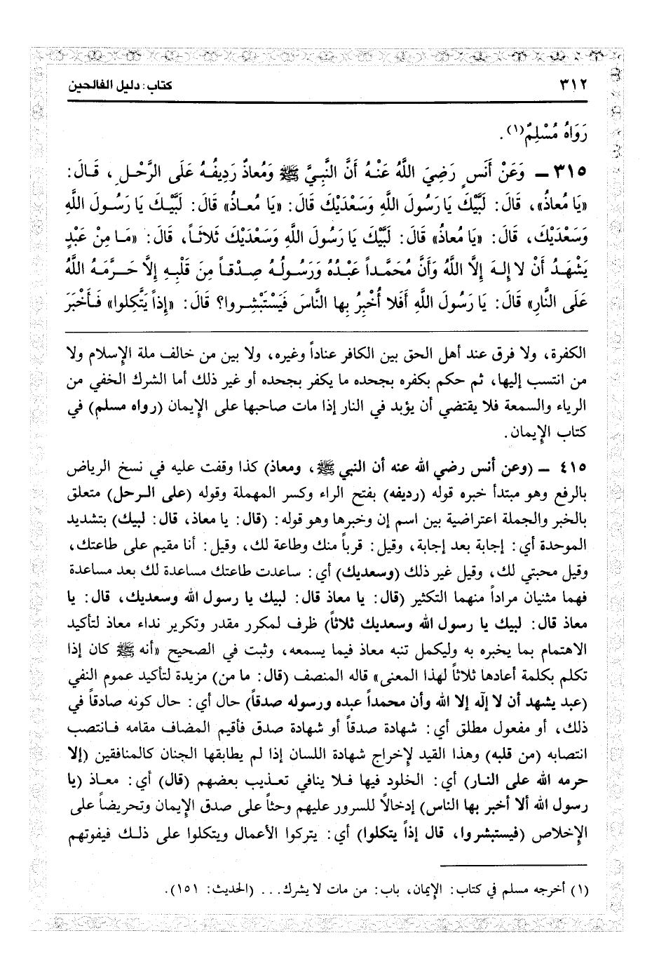 4415 - (وعن أنس رضي الله عنه أن النبيّ، ومعاذ) كذا وقفت عليه في نسخ الرياض بالرفع وهو مبتدأ خبره قوله (رديفه) بفتح الراء وكسر المهملة وقوله (على الرحل) متعلق بالخبر والجملة اعتراضية بين اسم إن وخبرها وهو قوله (قال يا معاذ؟ قال لبيك) بتشديد الموحدة، أي إجابة بعد إجابة، وقيل قربا منك وطاعة لك، وقيل أنا مقيم على طاعتك، وقيل محبتي لك، وقيل غير ذلك (وسعديك) أي ساعدت طاعتك مساعدة لك بعد مساعدة فهما مثنيان مراداً منهما التكثير (قال: يا معاذ، قال لبيك يا رسول الله وسعديك، قال يا معاذ، قال لبيك يا رسول الله وسعديك ثلاثاً) ظرف لمقرر مقدر وتكرير نداء معاذ لتأكيد الاهتمام بما يخبره به وليكمل تنبه معاذ فيما يسمعه، وثبت في الصحيح «أنه كان إذا تكلم بكلمة أعادها ثلاثاً لهذا المعنى» قاله المصنف (قال ما من) مزيدة لتأكيد عموم النفي (عبد يشهد أن لا إله إلا الله وأن محمداً عبده ورسوله صدقاً) حال: أي حال كونه صادقاً في ذلك، أو مفعول مطلق: أي شهادة صدقاً أو شهادة صدق فأقيم المضاف مقامه فانتصب انتصابه (من قلبه) وهذا القيد لإخراج شهادة اللسان إذا لم يطابقها الجنان كالمنافقين (إلا حرّمه الله على النار) أي الخلود فيها فلا ينافي تعذيب بعضهم (قال) أي معاذ (يا رسول الله ألا أخبر بها الناس) إدخالاً للسرور عليهم وحثاً على صدق الإيمان وتحريضاً على الإخلاص (فيستبشروا، قال إذاً يتكلوا) أي يتركوا الأعمال ويتكلوا على ذلك فيفوتهم
