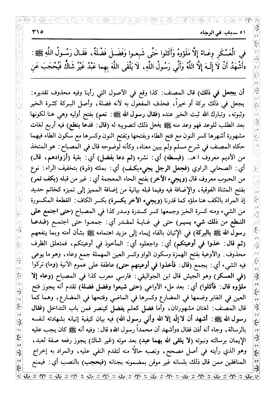 القطعة المكسورة من الشيء ومنه كسرة الخبز وجمعها كسر كسدرة وسدر كذا في «المصباح» (حتى اجتمع على النطع من ذلك شيء يسير) حتى فيه غاية لمقدر أي جمعوا حتى اجتمع (فدعا رسول الله - صلى الله عليه وسلم - بالبركة) في الإتيان بالفاء إيماء إلى مزيد اهتمامه بشأن أمته وبما ينفعهم (ثم قال: خذوا في أوعيتكم) أي واجعلوه: أي المأخوذ في أوعيتكم فمتعلق الظرف محذوف.I والأوعية بفتح الهمزة وسكون الواو وكسر العين المهملة جمع وعاء، وهو ما يوعى فيه الشيء أي يجمع (قال: فأخذوا في أوعيتهم حتى) عاطفة على عموم الآنية (ما) تركوا (في العسكري) وهو الجيش. قال ابن الجواليقي: فارسي معرب كذا في «المصباح» (وعاء إلا ملؤه قال فأكلوا) أي بعد ملء الأواعي (حتى شبعوا وفضل فضلة) تقدم أنه يجوز فتح العين في الغابر وضمها في المضارع وكسرها في الماضي وفتحها في المضارع وهما كما قال المصنف لغتان مشهورتان وأما فضل كعلم يفضل كينصر فمن باب التداخل (فقال رسول الله: أشهد أن لا إله إلا الله وأني رسول الله) فيه بيان كيفية إتيانه بشهادته لنفسه بالرسالة وجاء أنه أذّن فقال «وأشهد أن محمداً رسول الله» قال: وفيه أنه كان يجب عليه الإيمان برسالته ونبوته (لا يلقى الله بهما عبد) بعد موته (غير شاك) يجوز رفعه صفة لعبد، وهو الذي رأيته في أصل مصحح، ونصبه حالاً منه لتقدم النفي عليه، والمراد به إخراج المنافقين ممن قال ذلك بلسانه غير موقن بمضمونه بجنانه (فيحجب) بالنصب: أي فيمنع