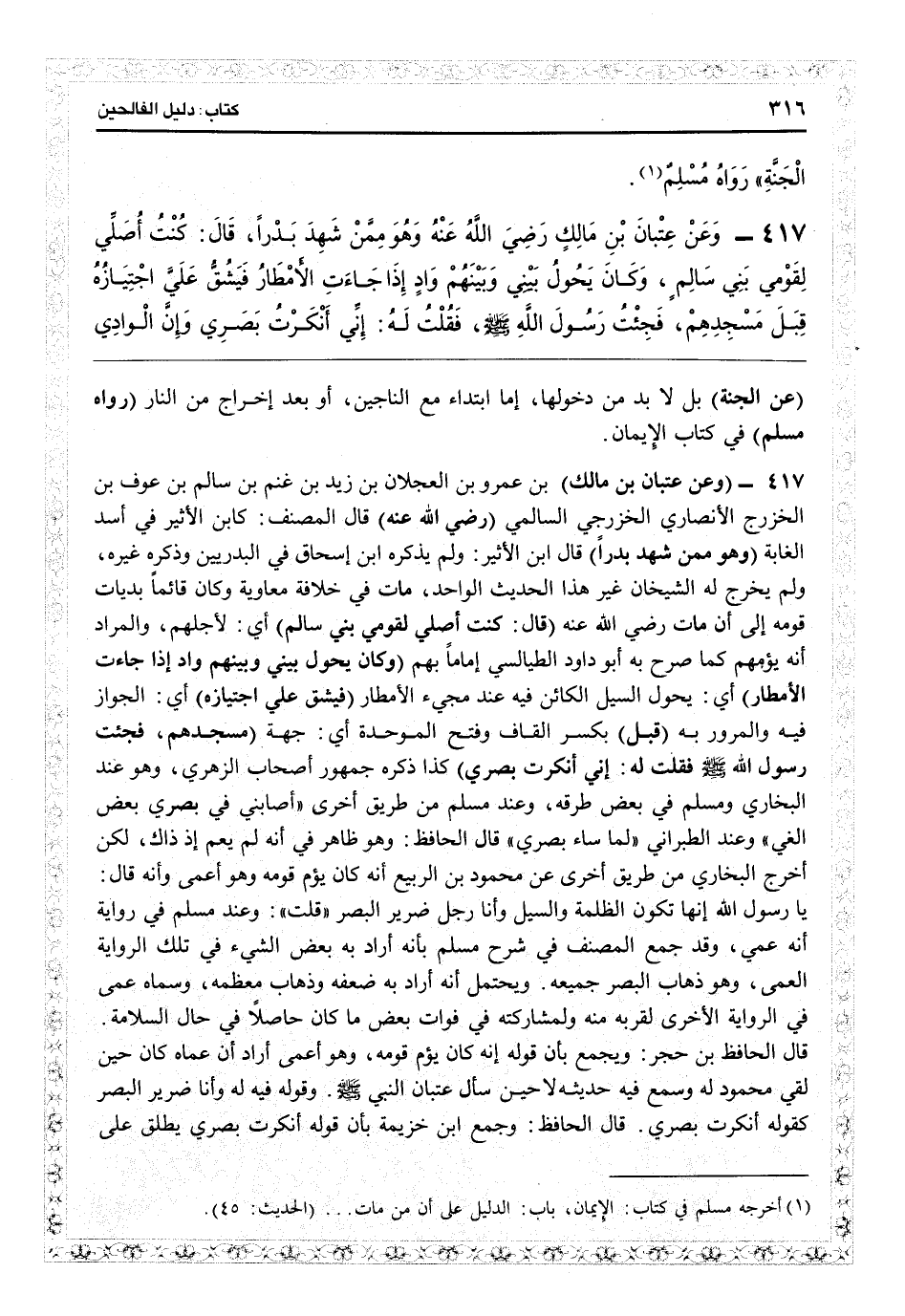 6417 - (وعن عتبان بن مالك) بن عمرو بن العجلان بن زيد بن غنم بن سالم بن عوف بن الخزرج الأنصاري الخزرجي السالمي (رضي الله عنه) قال المصنف: كابن الأثير في «أسد الغابة» (وهو ممن شهد بدراً) قال ابن الأثير: ولم يذكره ابن إسحاق في البدريين وذكره غيره، ولم يخرج له الشيخان غير هذا الحديث الواحد، مات في خلافة معاوية وكان قائماً بديات قومه إلى أن مات رضي الله عنه (قال: كنت أصلي لقومي بني سالم) أي لأجلهم، والمراد أنه يؤمهم كما صرح به أبو داود الطيالسي إماماً بهم (وكان يحول بيني وبينهم واد إذا جاءت الأمطار) أي يحول السيل الكائن فيه عند مجيء الأمطار (فيشق على اجتيازه) أي الجواز فيه والمرور به (قبل) بكسر القاف وفتح الموحدة أي جهة (مسجدهم، فجئت رسول الله - صلى الله عليه وسلم - فقلت له: إني أنكرت بصري) كذا ذكره جمهور أصحاب الزهري، وهو عند البخاري ومسلم في بعض طرقه وعند مسلم من طريق أخرى «أصابني في بصري بعض العمى» وعند الطبراني «لما ساء بصري» قال الحافظ: وهو ظاهر في أنه لم يعم إذ ذاك، لكن أخرج البخاري من طريق أخرى عن محمود بن الربيع أنه كان يؤم قومه وهو أمي وأنه قال: يا رسول الله إنها تكون الظلمة والسيل وأنا رجل ضرير البصر، قلت: وعند مسلم في رواية أنه عمي وقد جمع المصنف في «شرح مسلم» بأنه أراد به بعض الشيء في تلك الرواية العمى، وهو ذهاب البصر جميعه. ويحتمل أنه أراد به ضعفه وذهاب معظمه، وسماه عمى في الرواية الأخرى لقربه منه ولمشاركته في فوات بعض ما كان حاصلاً في حال السلامة. قال الحافظ: ابن حجر: ويجمع بأن قوله إنه كان يؤمّ قومه وهو أعمى أراد أن عماه كان حين لقي محمود له وسمع فيه حديثه لا حين سأل عتبان النبيّ وقوله فيه له وأنا ضرير البصر كقوله أنكرت بصري. قال الحافظ: وجمع ابن خزيمة بأن قوله أنكرت بصري يطلق على