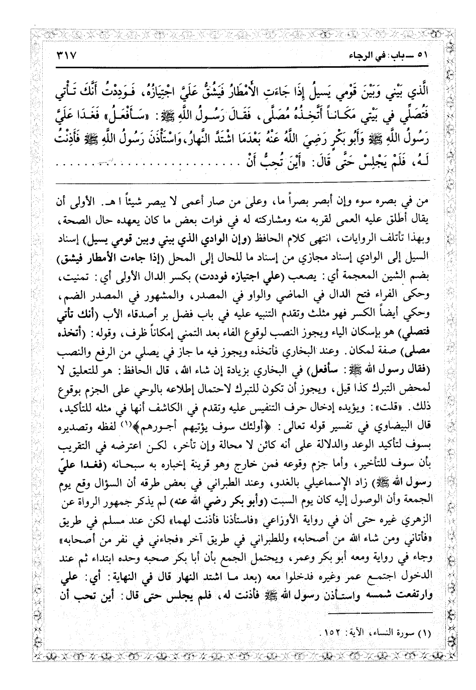 أطلق عليه العمى لقربه منه ومشاركته له في فوات بعض ما كان يعهده حال الصحة، وبهذا تألف الروايات، انتهى كلام الحافظ (وإن الوادي الذي بيني وبين قومي يسيل) إسناد السيل إلى الوادي إسناد مجازي من إسناد ما للحال إلى المحل (إذا جاءت الأمطار فيشق) بضم الشين المعجمة أي يصعب (على اجتيازه فوددت) بكسر الدال الأولى: أي تمنيت، وحكى الفراء فتح الدال في الماضي والواو في المصدر والمشهور في المصدر الضم، وحكي أيضاً الكسر فهو مثلث وتقدم التنبيه عليه في باب فضل برّ أصدقاء الأب (أنك تأتي فتصلي) هو بإسكان الياء ويجوز النصب لوقوع الفاء بعد التمني (مكاناً) ظرف وقوله (اتخذه مصلى) صفة لمكان وعند البخاري فاتخذه، ويجوز فيه ما جاز في يصلي من الرفع والنصب (فقال رسول الله: سأفعل) في البخاري بزيادة إن شاءالله، قال الحافظ: هو للتعليق لا لمحض التبرك كذا قيل، ويجوز أن تكون للتبرك لاحتمال اطلاعه بالوحي على الجزم بوقوع ذلك. قلت: ويؤيده إدخال حرف التنفيس عليه وتقدم في «الكاشف» أنها في مثله للتأكيد، قال البيضاوي في تفسير قوله تعالى: