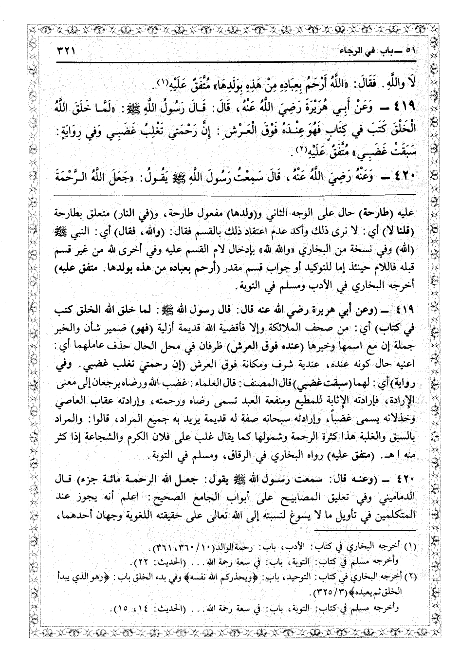 9420 - (وعنه قال: سمعت رسول الله - صلى الله عليه وسلم - يقول: جعل الله الرحمة مائة جزء) قال الدماميني في «تعليق المصابيح على أبواب الجامع الصحيح» : اعلم أنه يجوز عند المتكلمين في تأويل ما لا يسوغ نسبته إلى الله تعالى على حقيقته اللغوية وجهان: أحدهما،