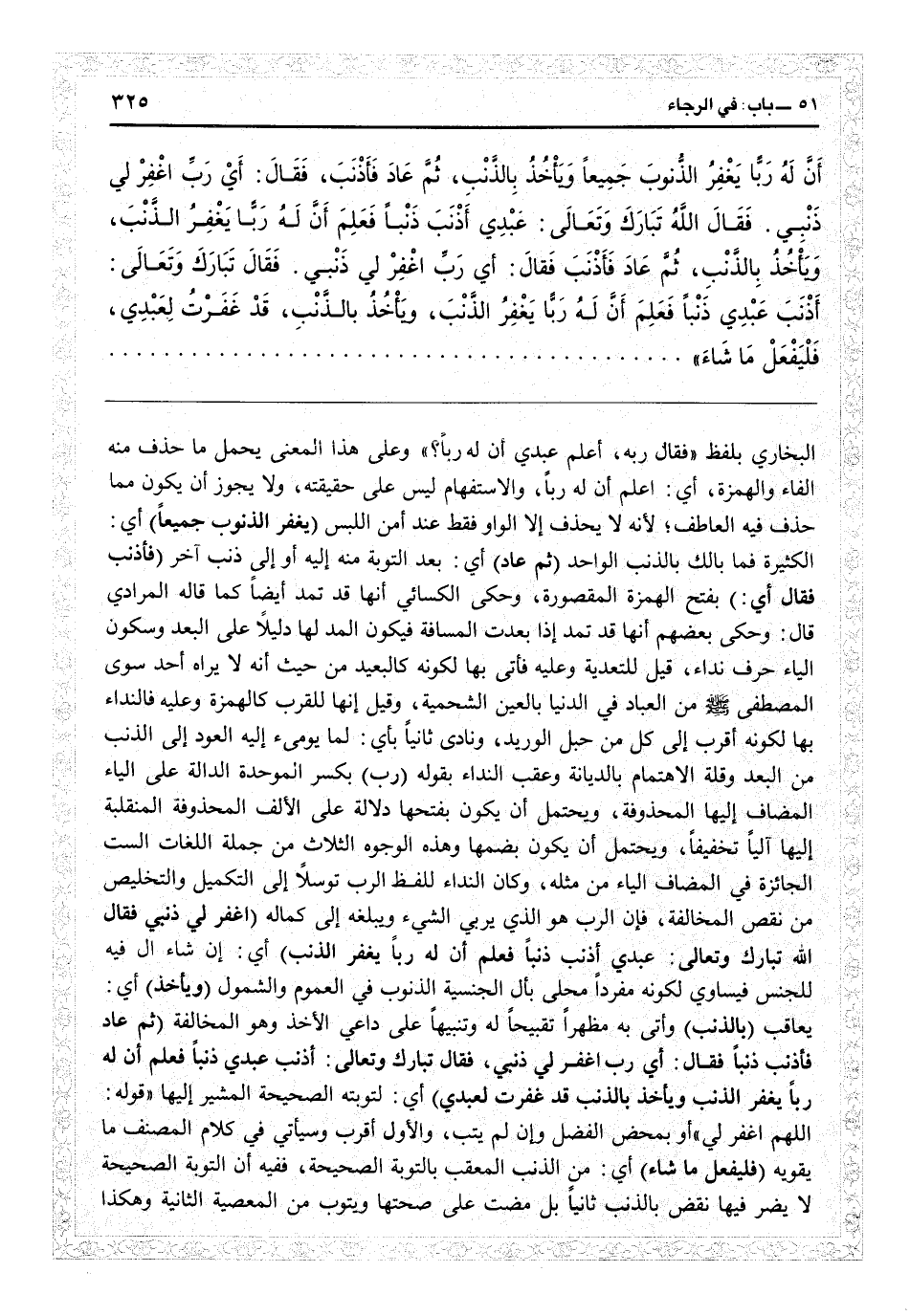 البخاري بلفظ «فقال ربه، أعلم عبدي أن له ربا؟» وعلى هذا المعنى يحمل ما حذف منه الفاء والهمزة، أي أعلم أن له رباً، والاستفهام ليس على حقيقته، ولا يجوز أن يكون مما حذف فيه العطف لأنه لا يحذف إلا الواو فقط عند أمن اللبس (يغفر الذنوب جميعاً) أي الكثيرة فما بالك بالذنب الواحد (ثم عاد) أي بعد التوبة منه إليه أو إلى ذنب آخر (فأذنب فقال أي) بفتح الهمزة المقصورة، وحكى الكسائي أنها قد تمد أيضاً كما قاله المرادي، قال: وحكى بعضهم أنها قد تمتد إذا بعدت المسافة فيكون المد لها دليلاً على البعد وسكون الياء حرف نداء، قيل للبعيد وعليه فأتى بها لكونه كالبعيد من حيث إنه لا يراه أحد سوى المصطفى من العباد في الدنيا بالعين الشحمية، وقيل إنها للقرب كالهمزة وعليه فالنداء بها لكونه أقرب إلى كل من حبل الوريد، ونادى ثانياً بأي لما يومىء إليه العود إلى الذنب من البعد وقلة الاهتمام بالديانة وعقب النداء بقوله (ربّ) بكسر الموحدة الدالة على الياء المضاف إليها المحذوفة ويحتمل أن يكون بفتحها دلالة على الألف المحذوفة المنقلبة إليها الياء تخفيفاً، ويحتمل أن يكون بضمها وهذه الوجوه الثلاث من جملة اللغات الست الجائزة في المضاف للياء من مثله، وكان النداء للفظ الربّ توسلاً إلى التكميل والتخليص من نقص المخالفة، فإن الربّ هو الذي