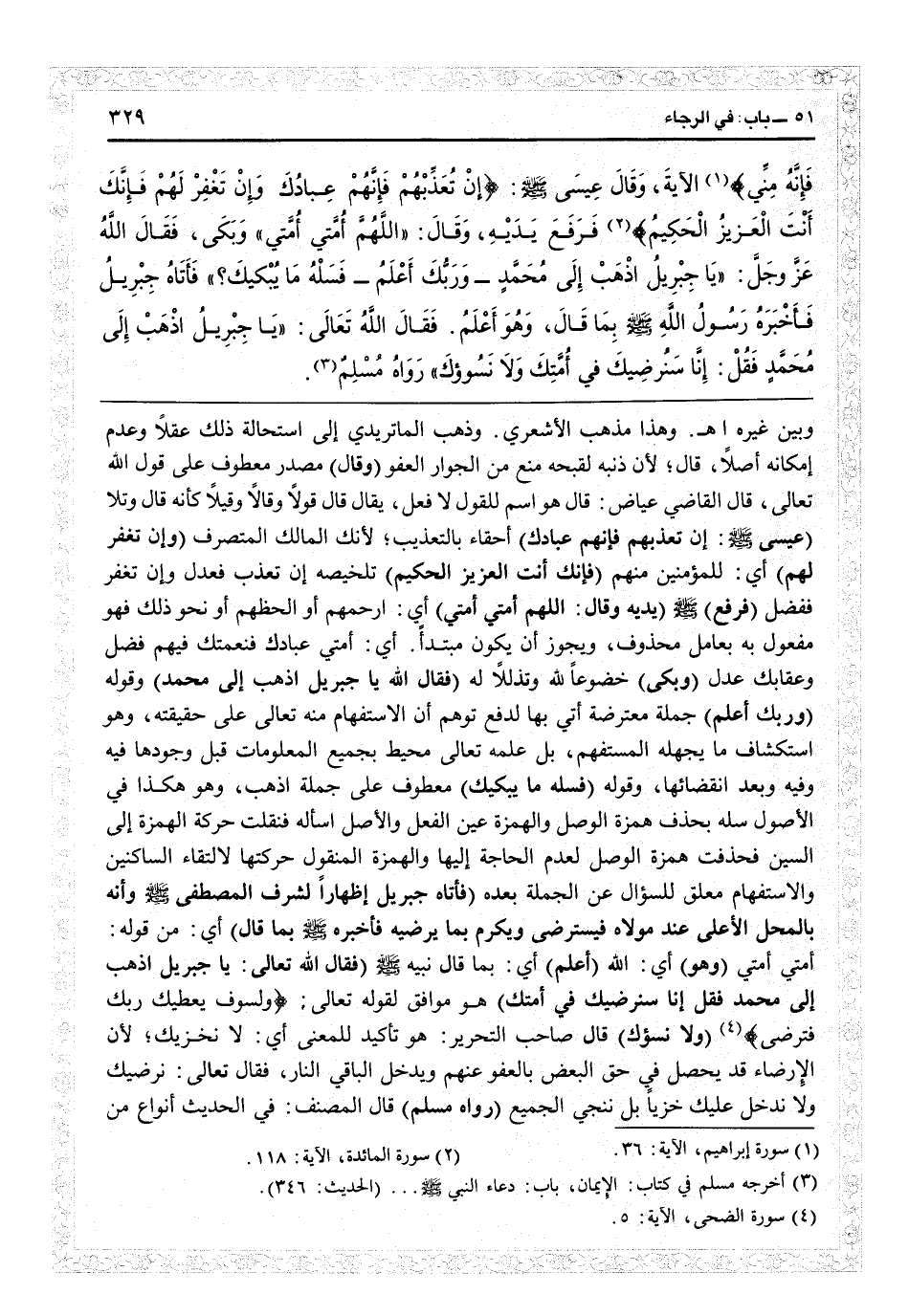 وبين غيره اهـ. وهذا مذهب الأشعري، وذهب الماتريدي إلى استحالة ذلك عقلاً وعدم إمكانه أصلاً، قال: لأن ذنبه لقبحه منع من جواز العفو (وقال) مصدر معطوف على قول الله تعالى، قال القاضي عياض: قال هو اسم للقول لا فعل، يقال قال قولاً وقالاً وقيلاً كأنه قال وتلا (عيسى: {إن تعذبهم فإنهم عبادك} ) أحقاء بالتعذيب لأنك المالك المتصرف ( {وإن تغفر لهم} ) أي للمؤمنين منهم ( {فإنك أنت العزيز الحكيم} ) تلخيصه إن تعذب فعدل وإن تغفر ففضل (فرفع) (يديه وقال: اللهم أمتي أمتي) أي ارحمهم أو الحظهم أو نحو ذلك فهو مفعول به بعامل محذوف، ويجوز أن يكون مبتدأ: أي أمتي عبادك فنعمتك فيهم فضل وعقابك عدل (وبكى) خضوعاً وتذللاً له (فقال الله: يا جبريل اذهب إلى محمد) وقوله (وربك أعلم) جملة معترضة أتى بها لدفع توهم أن الاستفهام منه تعالى على حقيقته، وهو استكشاف ما يجهله المستفهم، بل علمه تعالى محيط بجميع المعلومات قبل وجودها فيه وفيه وبعد انقضائها وقوله (فسله ما يبكيك) معطوف على جملة اذهب، وهو هكذا في الأصول سله بحذف همزة الوصل والهمزة عين الفعل والأصل اسأله فنقلت حركة الهمزة إلى السين فحذفت همزة الوصل لعدم الحاجة إليها والمزة