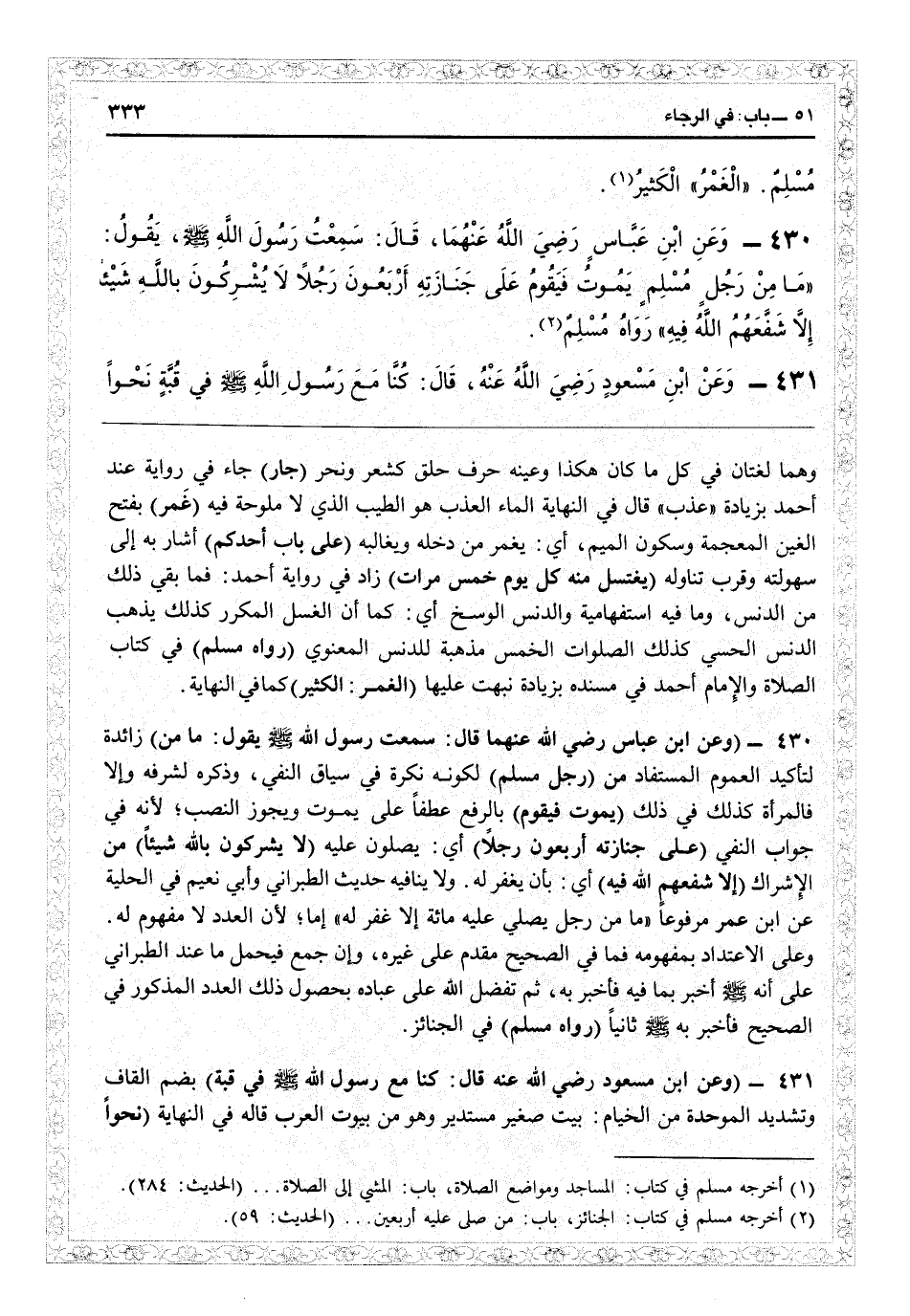 19430 - (وعن ابن عباس رضي الله عنهما قال: سمعت رسول الله - صلى الله عليه وسلم - يقول: ما من) زائدة لتأكيد العموم المستفاد من (رجل مسلم) لكونه نكرة في سياق النفي، وذكره لشرفه وإلا فالمرأة كذلك في ذلك (يموت فيقوم) بالرفع عطفاً على يموت، ويجوز النصب لأنه في جواب النفي (على جنازته أربعون رجلاً) أي يصلون عليه (لا يشركون با شيئاً) من الإشراك (إلا شفعهم الله فيه) أي بأن يغفر له، ولا ينافيه حديث الطبراني وأبي نعيم في «الحلية» عن ابن عمر مرفوعاً «ما من رجل يصلي عليه مائة إلا غفر له» إما لأن العدد لا مفهوم له، وعلى الاعتداد بمفهومه فما في الصحيح مقدم على غيره، وإن جمع فيحمل ما عند الطبراني على أنه أخبر بما فيه، فأخبر به، ثم تفضل الله على عباده بحصول ذلك العدد المذكور في الصحيح فأخبر به ثانياً (رواه مسلم) في الجنائز.