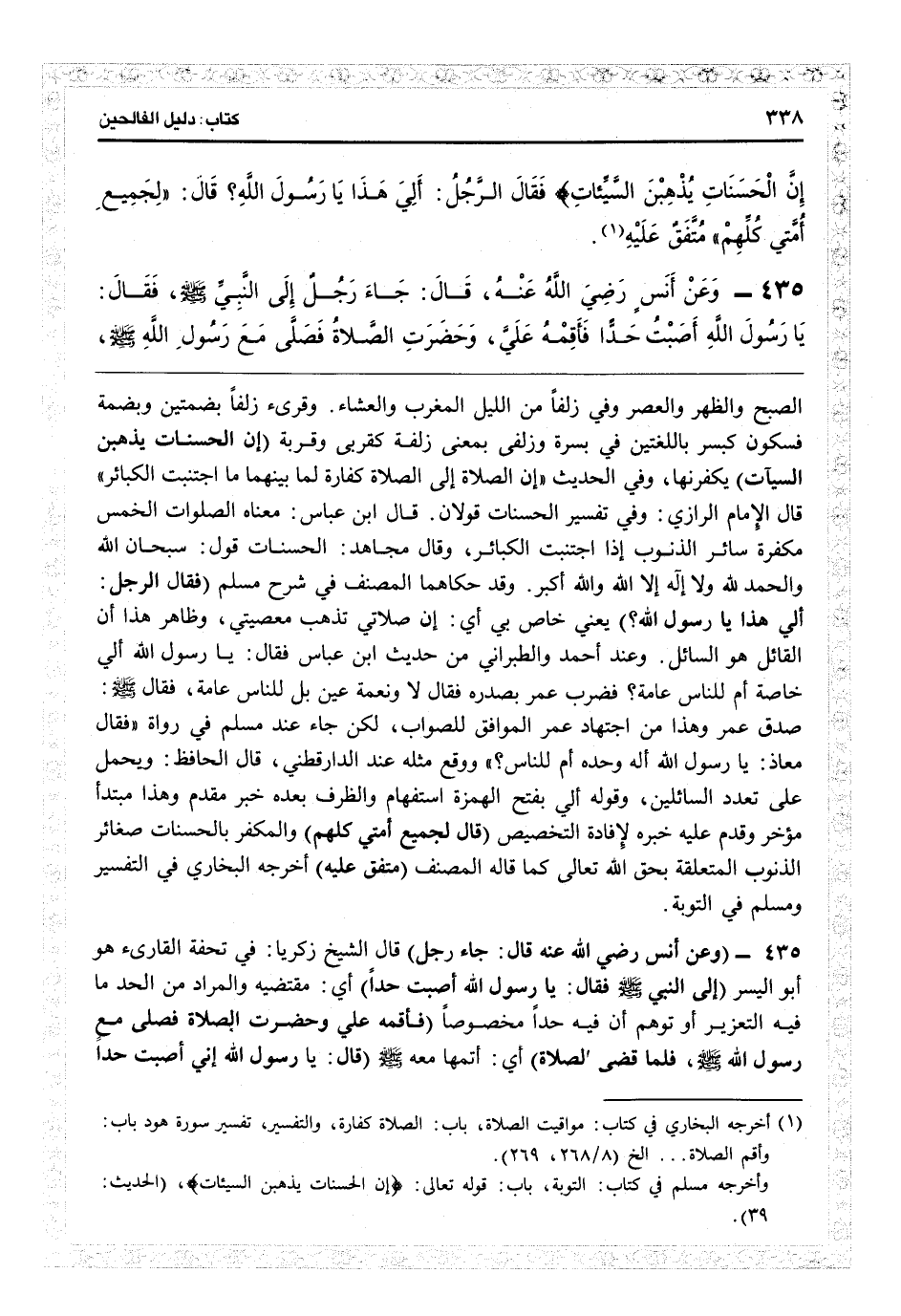 الصبح والظهر والعصر وفي زلفا من الليل المغرب والعشاء، وقرىء زلفا بضمتين وبضمة فسكون كبسر باللغتين في بسرة وزلفى بمعنى زلفة كقربى وقربة ( {إن الحسنات يذهبن السيئات} ) يكفرنها، وفي الحديث «إن الصلاة إلى الصلاة كفارة لما بينهما ما اجتنبت الكبائر» قال الإمام الرازي: وفي تفسير الحسنات قولان قال ابن عباس: معناه الصلوات الخمس مكفرة سائر الذنوب إذا اجتنبت الكبائر، وقال مجاهد: الحسنات قول: سبحان الله والحمد ولا إله إلا الله وا أكبر. وقد حكاهما المصنف في «شرح مسلم» (فقال الرجل: ألي هذا يا رسول الله) يعني خاص بي: أي أن صلاتي تذهب معصيتي، وظاهر هذا أن القائل هو السائل. وعند أحمد والطبراني من حديث ابن عباس «فقال: يا رسول الله ألي خاصة أم للناس عامة فضرب عمر بصدره فقال لا ونعمة عين بل للناس عامة، فقال: صدق عمر» وهذا من اجتهاد عمر الموافق للصواب لكن جاء عند مسلم في رواية «فقال معاذ: يا رسول الله أله وحده أم للناس؟» ووقع مثله عند الدارقطني، قال الحافظ: ويحمل على تعدد السائلين، وقوله ألي بفتح الهمزة استفهام والظرف بعده خبر مقدم وهذا مبتدأ مؤخر وقدم عليه خبره لإفادة التخصيص (قال لجميع أمتي كلهم) والمكفر بالحسنات صغائر الذنوب المتعلقة بحق الله تعالى كما قاله المصنف (متفق عليه) أخرجه البخاري في التفسير ومسلم في التوبة.