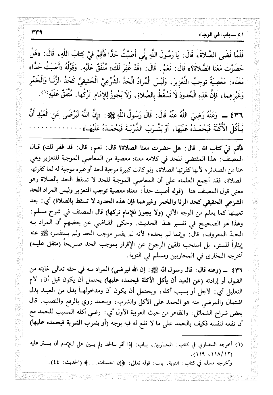 (قوله أصبت حداً: معناه معصية توجب التعزير وليس المراد الحد الشرعي الحقيقي كحدّ الزنا والخمر وغيرهما فإن هذه الحدود لا تسقط بالصلاة) أي بعد تعينها كما يعلم من الوجه الآتي (ولا يجوز للإمام تركها) قال المصنف في «شرح مسلم» : وهذا هو الصحيح في تفسير هذا الحديث، وحكى القاضي عن بعضهم أن المراد به الحدّ المعروف، قال: وإنما لم يحده لأنه لم يفسر موجب الحد ولم يستفسره عنه إيثاراً للستر، بل استحب تلقين الرجوع عن الإقرار بموجب الحد صريحاً (متفق عليه) أخرجه البخاري في المحاربين ومسلم في التوبة.