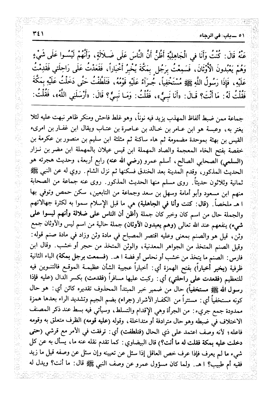 جماعة ممن ضبط ألفاظ «المهذب» يزيد فيه نوناً وهو غلط فاحش ومنكر ظاهر نبهت عليه لئلا يغتّر به، وعبسة هو ابن عامر بن خالد بن عاصرة بن عتاب ويقال بن غفار بن امريء القيس بن بهثة بموحدة مضمومة ثم هاء ساكنة ثم مثلثة ابن سليم بن منصور بن عكرمة بن خصفة بفتح الخاء المعجمة والصاد المهملة ابن قيس عيلان بالمهملة ابن مضر بن نزار (السلمي) الصحابي الصالح، أسلم عمرو (رضي الله عنه) رابع أربعة، وحديث هجرته هو الحديث المذكور وقدم المدينة بعد الخندق فسكنها ثم نزل الشام، روي له عن النبي ثمانية وثلاثون حديثاً روى مسلم منها الحديث المذكور؛ روى عنه جماعة من الصحابة منهم ابن مسعود وأبو أمامة وسهل بن سعد وجماعة من التابعين، سكن حمص وتوفي بها اهـ. ملخصاً (قال كنت وأنا في الجاهلية) هي ما قبل الإسلام سموا به لكثرة جهالاتهم والجملة حال من اسم كان، وخبر كان جملة (أظن أن الناس على ضلالة وأنهم ليسوا على شيء) ينفعهم عند الله تعالى (وهم يعبدون الأوثان) جملة حالية من اسم ليس والأوثان جمع وثن قيل هو والصنم بمعنى، وعليه اقتصر «المصباح» في مادة وثن وزاد في مادة صنم قوله: وقيل الصنم المتخذ من الجواهر المعدنية، والوثن المتخذ من حجر أو خشب. وقال ابن فارس الصنم ما يتخذ من خشب أو نحاس أو فضة اهـ. (فسمعت برجل بمكة) الباء الثانية ظرفية (يخبر أخباراً) بفتح الهمزة: أي أخباراً عجيبة الشأن عظيمة الموقع فالتنوين فيه للتعظيم (فقعدت على راحلتي) أي ركبت عليها مسافراً (فقدمت) بكسر الدال (عليه فإذا رسول الله صلى الله عليه وسلم مستخفياً) حال من ضمير خبر المبتدأ المحذوف تقديره كائن: أي هو حال كونه مستخفياً: أي مستتراً من الكفار الأشرار (جرآء) بضم الجيم وتشديد الراء بعدها همزة ممدودة جمع جرىء: من الجرأة وهي الإقدام والتسلط وسيأتي فيه بسط عند ذكر المصنف الاختلاف في ضبطه وهو حال مترادفة أو متداخلة، وقوله (عليه قومه) الظرف متعلق به وقومه