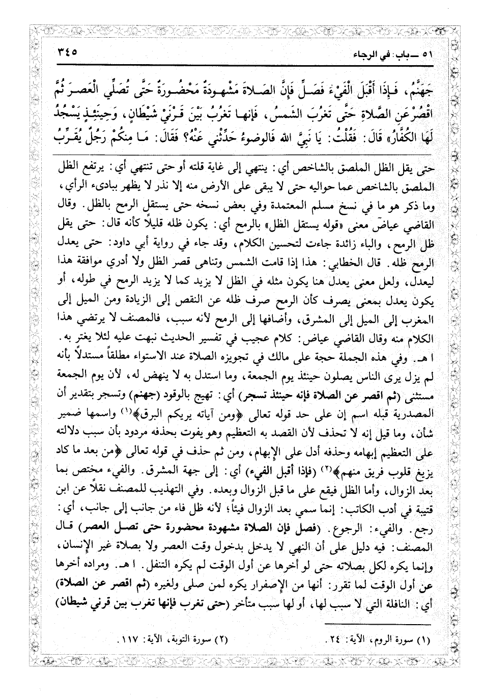 {ومن آياته يريكم البرق} (الروم: 24) أو اسمها ضمير شأن، وما قيل إنه لا تحذف لأن القصد به التعظيم وهو يفوت بحذفه مردود بأن سبب دلالته على التعظيم إبهامه وحذفه أدل على الإبهام، ومن ثم حذف في قوله تعالى: {من بعد ما كاد يزيغ قلوب فريق منهم} (التوبة: 117) (فإذا أقبل الفيء) أي: إلى الجهة المشرق. والفيء مختص بما بعد الزوال، وأما الظل فيقع على ما قبل الزوال وبعده. وفي «التهذيب» للمصنف نقلاً عن ابن قتيبة في «أدب الكاتب» إنما سمي بعد الزوال فيئاً لأنه ظل فاء من جانب إلى جانب: أي رجع والفيء الرجوع (فصل فإن الصلاة مشهودة محضورة حتى تصلي العصر) قال المصنف: فيه دليل على أن النهي لا يدخل بدخول وقت العصر ولا بصلاة غير الإنسان، وإنما يكره لكل بصلاته حتى لو أخرها عن أول الوقت لم يكره التنفل اهـ. ومراده أخرها عن أول الوقت لما تقرّر أنها من الإصفرار يكره لمن صلى ولغيره (ثم اقصر عن الصلاة) أي النافلة التي لا سبب لها أو لها سبب متأخر (حتى تغرب الشمس فإنها تغرب بين قرني شيطان)
