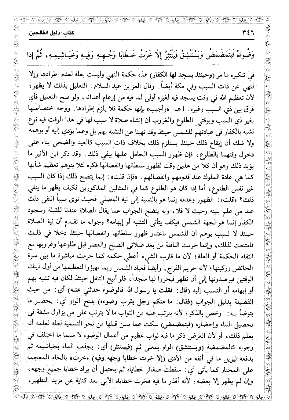 في تنكيره ما مر (وحينئذٍ يسجد لها الكفار) هذه حكمة النهي وليست بعلة لعدم اطرادها وإلا لنهي عن ذات السبب وفي مكة أيضاً. وقال العز بن عبد السلام: التعليل لذلك لا يظهر لأن تعظيم الله في وقت يسجد فيه لغيره أولى لما فيه من إرغام أعدائه، ولو صح التعليل فأي فرق بين ذي السبب وغيره اهـ. وأجيب بأنها حكمة فلا يلزم اطرادها ووجه اختصاصها بغير ذي السبب وبوقتي الطلوع والغروب أن إنشاء صلاة لا سبب لها في هذا الوقت فيه نوع تشبه بالكفار في عبادتهم للشمس حينئذٍ وقد نهينا عن التشبه بهم، بل وعما يؤدي إليه أو يوهمه ولا شك أن إيقاع ذلك حينئذٍ يستلزم ذلك بخلاف ذات السبب كالعيد والضحى بناء على دخول وقتهما بالطلوع، فإن ظهور السبب الحامل عليها ينفي ذلك، وقد ذكر ابن الأثير ما يؤيد ذلك وهو أن كلا من هذين وقت لظهور سلطانها وانفصالها فكره لئلا يتوهم تعظيم شأنها كما هي عادة الملوك عند قدومهم وانفصالهم. فإن قلت: إنما يتضح ذلك إذا كان السبب غير نفس الطلوع، أما إذا كان هو الطلوع كما في المثالين المذكورين فكيف يظهر ما ينفي ذلك. قلت: الظهور وعدمه إنما هو بالنسبة إلى نية المصلي فحيث نوى سبباً انتفى ذلك عند من علم بنيته وحيث لا فلا، وبه يتضح الجواب عما يقال الصلاة عندنا للقبلة وسجود الكفار إنما هو لجهة الشمس فكيف يتأتى التشبه أو إيهامه؟ وجوابه ما تقدم أن نية الصلاة حينئذٍ لا لسبب يوهم أن للشمس باعتبار ظهور سلطانها وانفصالها حينئذٍ دخلا في ذلك فامتنعت لذلك، وإنما حرمت النافلة من بعد صلاتي الصبح والعصر قبل طلوعها وغروبها مع انتفاء الحكمة أو العلة لأن ما قارب الشيء أعطي حكمه كما حرمت مباشرة ما بين سرة الحائض وركبتها لأنه حريم الفرج، وأيضاً فعباد الشمس ربما تهيئوا لتعظيمها من أول ذينك الوقتين فيرصدونها إلى أن تظهر فيخروا لها سجداً، فلو أبيح التنفل حينئذٍ لكان فيه تشبه بهم أو إيهامه أو التسبب إليه (قال: فقلت يا رسول الله فالوضوء حدثني عنه) أي من حيث الفضيلة بدليل الجواب (فقال: ما منكم رجل يقرب وضوءه) بفتح الواو أي يحضر ما يتوضأ به، وخص بالذكر لأنه يترتب عليه من الثواب ما لا يترتب على من يزاول مشقة في تحصيل الماء وإحضاره (فيتمضمض) سكت عما يسن قبلها من نحو التسمية لعله لعلمه أنه يعلم ذلك أو لأن الغرض ذكر ما فيه ثواب عظيم من أعمال الوضوء لا سيما ما اختلف في وجوبه كالمضمضة (ويستنشق) الواو بمعنى ثم (فيستنثر) أي يجذب الماء بخياشيمه ثم يدفعه ليزيل ما في أنفه من الأذى (إلا خرت خطايا وجهه، وفيه) «خرت» بالخاء المعجمة على المختار كما يأتي أي سقطت صغائر خطاياه ثم يحتمل أن يراد خطايا جميع وجهه، وإن لم يظهر إلا بعضه لأنه أقذر ما فيه فخرت خطاياه الآني بعد كناية عن مزيد التطهير،
