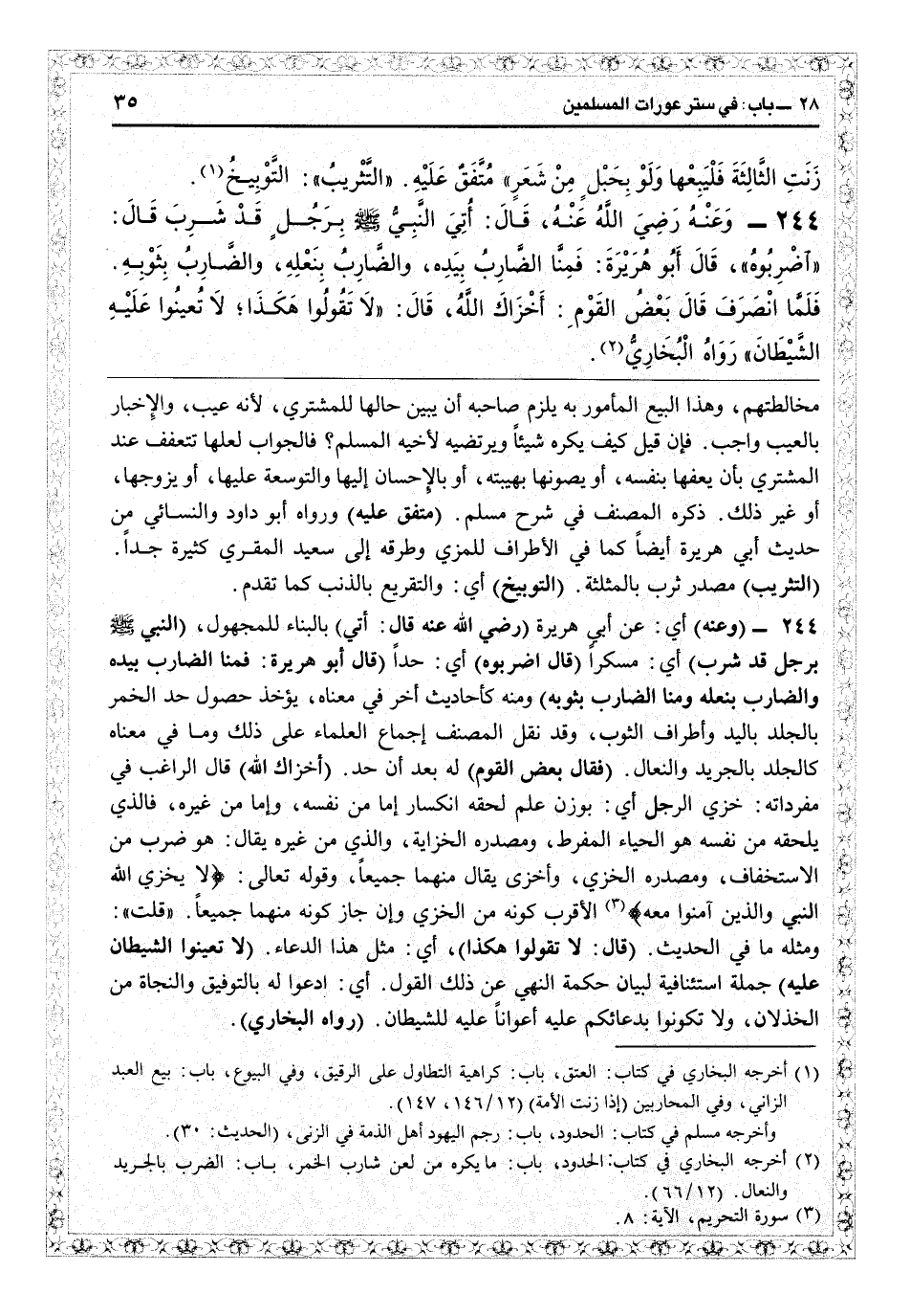 2434 - (وعنه) أي عن أبي هريرة (رضي الله عنه قال: أتى) بالبناء للمجهول (النبي برجل قد شرب) أي مسكراً (قال: اضربوه) أي حداً (قال أبو هريرة: لنا الضارب بيده والضارب بنعله والضارب بثوبه) ومنه كأحاديث أخر في معناه يؤخذ حصول حد الخمر بالجلد باليد وأطراف الثوب وقد نقل الصنف إجماع العلماء على ذلك وما في معناه في مفرداته خزي الرجل: أي بوزن علم، لحقه انكسار؟ إما من نفسه وإما من غيره. فالذي يلحقه من نفسه هو الحياء المفرط ومصدره الخزاية، والذي من غيره يقال هو ضرب من الاستخفاف ومصدره الخزي وأخزى يقال منهما جميعاً. وقوله تعالى: {لا يخزي الله النبي والذين آمنوا معه} (التحريم: 8) الأقرب كونه من الخزي وإن جاز كونه منهما جميعاً. قلت: ومثله ما في الحديث (قال: لا تقولوا هكذا) أي مثل هذا الدعاء (لا تعينوا عليه الشيطان) جملة استئنافية لبيان حكمة النهي عن ذلك القول: أي ادعوا له بالتوفيق والنجاة من الخذلان ولا تكونوا بدعائكم عليه أعواناً عليه للشيطان (رواه البخاري) .