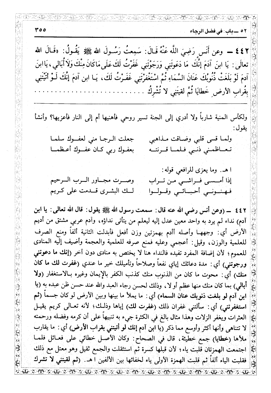 3442 - (وعن أنس رضي الله عنه قال: سمعت رسول الله - صلى الله عليه وسلم - يقول: قال الله تعالى يا ابن آدم) نداء لم يرد به واحد معين عدل إليه ليعلم من يتأتى نداؤه، وآدم عربي مشتق من أديم الأرض أي وجهها، وأصله أأدم بهمزتين وزن أفعل فأبدلت الثانية ألفاً ومنع الصرف للعلمية والوزن، وقيل أعجمي وعليه فمنع صرفه للعلمية والعجمة وأضيف إليه المنادى للعموم لأن إضافته المفرد تقيده فالنداء هنا لا يختص به منادى دون آخر (إنك ما دعوتني ورجوتني) أي مدة دعائك إياي نفعاً وصلاحاً وتأميلك خبر ما عندي (غفرت لك ما كان منك) أي محوت ما كان من الذنوب منك كذنب الكفر بالإيمان وغيره بالاستغفار (ولا أبالي) بما كان منك منها عظم أولا، وذلك لحسن رجاء العبد وا عند حسن ظن عبده به (يا ابن آدم لو بلغت ذنوبك عنان السماء) أي ما يملأ ما بينها وبين الأرض لو كان جسماً (ثم استغفرتني) أي سألتني غفران ذلك (غفرت لك) إياها وذلك لأنه تعالى كريم يقيل العثرات ويغفر الزلات وهذا مثال بالغ في الكثرة جيء به تنبيهاً على أن كرمه وفضله ورحمته لا تتناهى وأنها أكثر وأوسع مما ذكر (يا ابن آدم إنك لو أتيتني بقراب الأرض) أي ما يقارب ملأها (خطايا) جمع خطيئة، قال في «الصحاح» : وكان الأصل خطائىء على فعائل فلما اجتمعت الهمزتان قلبت ياء لأن قبلها كسرة ثم استثقلت والجمع ثقيل وهو معتل مع ذلك فقلبت الياء ألفاً ثم قلبت الهمزة الأولى ياء لخفائها بين الألفين اهـ. (ثم لقيتني لا تشرك