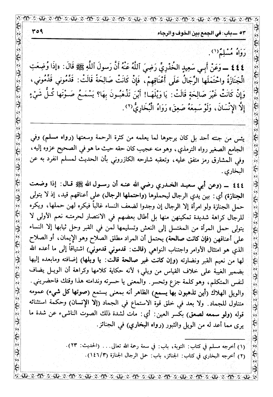 2444 - (وعن أبي سعيد الخدري رضي الله عنه: أن رسول الله - صلى الله عليه وسلم - قال: إذا وضعت الجنازة) أي بين يدي الرجال ليحملوها (واحتملها الرجال على أعناقهم) قيد إذ لا يتولى حمل الجنازة ولو امرأة إلا الرجال إن وجدوا لضعف النساء غالباً فيكره لهن حملها، ويكره للرجال كراهة شديدة تمكينهن منها، بل أطال بعضهم في الانتصال لحرمته: نعم الأولى لا يتولى حمل المرأة من المغتسل إلى النعش وتسليمها لمن في القبر وحلّ ثيابها إلا النساء على أعناقهن (فإن كانت صالحة) يحتمل أن المراد مطلق الصلاح وهو الإيمان، والصلاح الذي هو امتثال الأوامر واجتناب النواهي (قالت: قدموني قدموني) اشتياقاً إلى ما أعدّه الله لها من نعيم القبر ونضارته (وإن كانت غير صالحة قالت: يا ويلها) إضافته وما بعده إليها بضمير الغيبة على خلاف القياس من ويلي لأنه حكاية كلامها وكراهة أن الويل يضاف لنفس المتكلم، وهو كلمة جوع وتحسر، والمعنى: يا حسرته وندامته هذا وقتك فاحضريني. والويل الهلاك (أين تذهبون بها يسمع) الظاهر أنه بمعنى يستمع (صوتها كل شيء) عمومه متناول للجماد ولا بعد في خلق قوّة الاستماع في الجماد (إلا الإنسان) وحكمة استثنائه قوله (ولو سمعه لصعق) بكسر العين: أي مات لشدة ذلك الصوت الناشيء عن شدة ما يرى مما أعد له من الويل والثبور (رواه البخاري) في الجنائز.