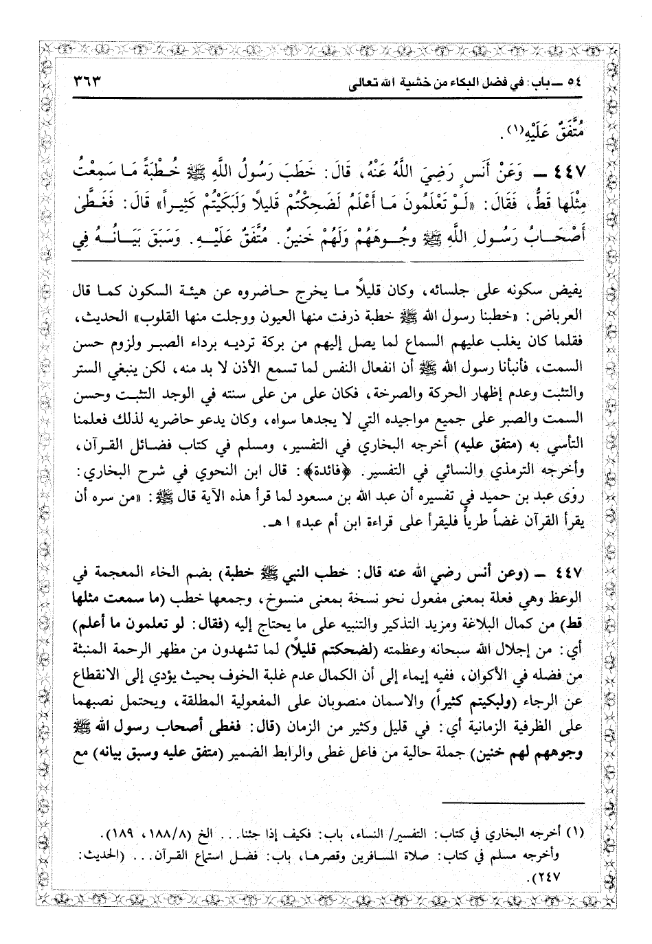 2447 - (وعن أنس رضي الله عنه قال: خطب رسول الله - صلى الله عليه وسلم - خطبة) بضم الخاء المعجمة في الوعظ وهي فعلة بمعنى مفعول نحو نسخة بمعنى منسوح، وجمعها خطب (ما سمعت مثلها قط) من كمال البلاغة ومزيد التذكير والتنبيه على ما يحتاج إليه (فقال: لو تعلمون ما أعلم) أي من إجلال الله سبحانه وعظمته (لضحكتم قليلاً) لما تشهدون من مظهر الرحمة المنبثة من فضله في الأكون، ففيه إيماء إلى أن الكمال عدم غلبة الخوف بحيث يؤدي إلى الانقطاع عن الرجاء (ولبكيتم كثيراً) والاسمان منصوبان على المفعولية المطلقة، ويحتمل نصبهما على الظرفية الزمانية أي في قليل وكثير من الزمان (قال: فغطى أصحاب رسول الله - صلى الله عليه وسلم - وجوههم لهم خنين) جملة حالية من فاعل غطى والرابط الضمير (متفق عليه وسبق بيانه) مع