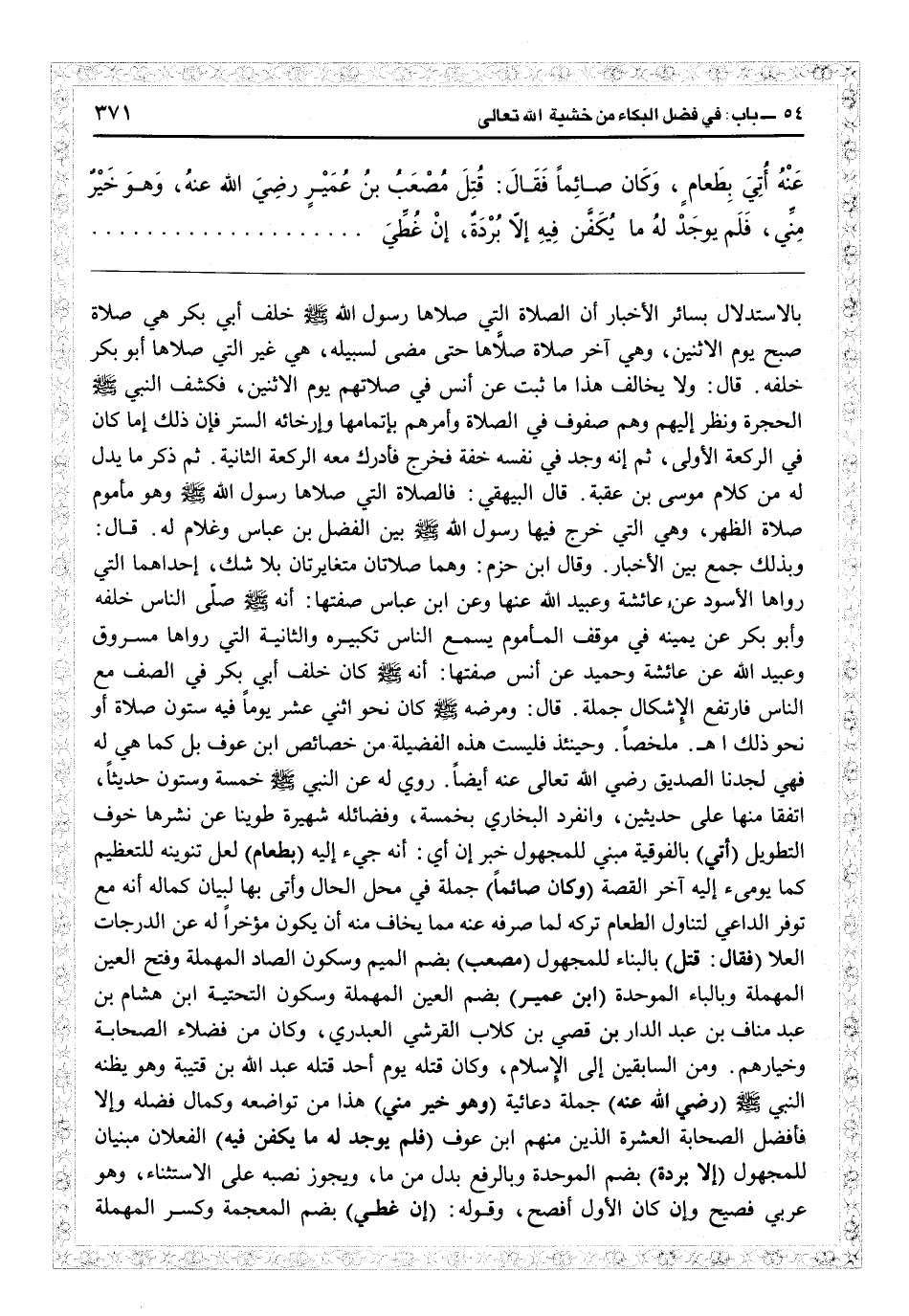 على حديثين، وانفرد البخاري بخمسة، وفضائله شهيرة طوينا عن نشرها خوف التطويل (أتى) بالفوقية مبني للمجهول خبر أن: أي إنه جيء إليه (بطعام) لعل تنوينه للتعظيم كما يومىء إليه آخر القصة (وكان صائماً) جملة في محل الحال وأتى بها لبيان كماله أنه مع توافر الداعي لتناول الطعام تركه لما صرفه عنه مما يخاف منه أن يكون مؤخراً له عن الدرجات العلا (فقال قتل) بالبناء للمجهول (مصعب) بضم الميم وسكون الصاد المهملة وفتح العين المهملة وبالباء الموحدة (ابن عمير) بضم العين المهملة وسكون التحتية ابن هشام بن عبد مناف بن عبد الدار بن قصى بن كلاب القرشي العبدري وكان من فضلاء الصحابة وخيارهم ومن السابقين إلى الإسلام، وكان قتله يوم أحد قتله عبد الله بن قتيبة وهو يظنه النبي (رضي الله عنه) جملة دعائية (وهو خير مني) هذا من تواضعه وكمال فضله وإلا فأفضل الصحابة العشرة الذين منهم ابن عوف (فلم يوجد له ما يكفن فيه) الفعلان مبنيان للمجهول (إلا بردة) بضم الموحدة وبالرفع بدل من ما، ويجوز نصبه على الاستثناء، وهو عربي فصيح وإن كان الأول أفصح، وقوله (إن غطى) بضم المعجمة وكسر المهملة