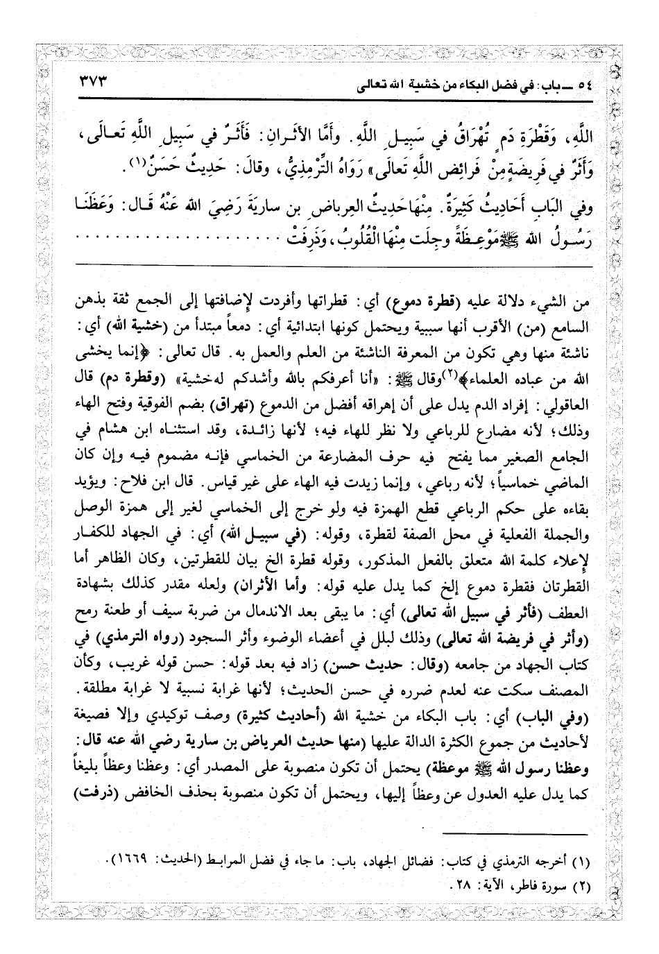 قال تعالى: {إنما يخشى الله من عباده العلماء} (فاطر: 28) وقال: «أنا أعرفكم با وأشدكم له خشية» (وقطرة دم) قال العاقولي. إفراد الدم يدل على أن إهراقه أفضل من الدموع (تهراق) بضم الفوقية وفتح الهاء وذلك لأنه مضارع للرباعي ولا نظر للهاء فيه لأنها زائدة، وقد استثناه ابن هشام في «الجامع الصغير» مما يفتح فيه حرف المضارعة من الخماسي فإنه مضمون فيه وإن كان الماضي خماسياً لأنه رباعي. وإنما زيدت فيه الهاء على غير قياس. قال ابن فلاح ويؤيد بقاءه على حكم الرباعي قطع الهمزة فيه ولو خرج إلى الخماسي لغير إلى همزة الوصل والجملة الفعلية في محل الصفة لقطرة، وقوله (في سبيل ا) أي في الجهاد للكفار لإعلاء كلمة الله متعلق بالفعل المذكور وقوله قطرة الخ بيان للقطرتين، وكان الظاهر أمّا القطرتان فقطرة دموع الخ كما يدل عليه قوله (وأما الأثران) ولعله مقدر كذلك بشهادة العطف (فأثر في سبيل الله تعالى) أي ما يبقى بعد الاندمال من ضربة سيف أو طعنة رمح (وأثر في فريضة الله تعالى) وذلك لبلل في أعضاء الوضوء وأثر السجود (رواه الترمذي) في كتاب الجهاد من «جامعه» (وقال: حديث حسن) زاد فيه بعد قوله حسن قوله غريب، وكان المصنف سكت عنه لعدم ضرره في حسن الحديث لأنها غرابة نسبية لا غرابة مطلقة.