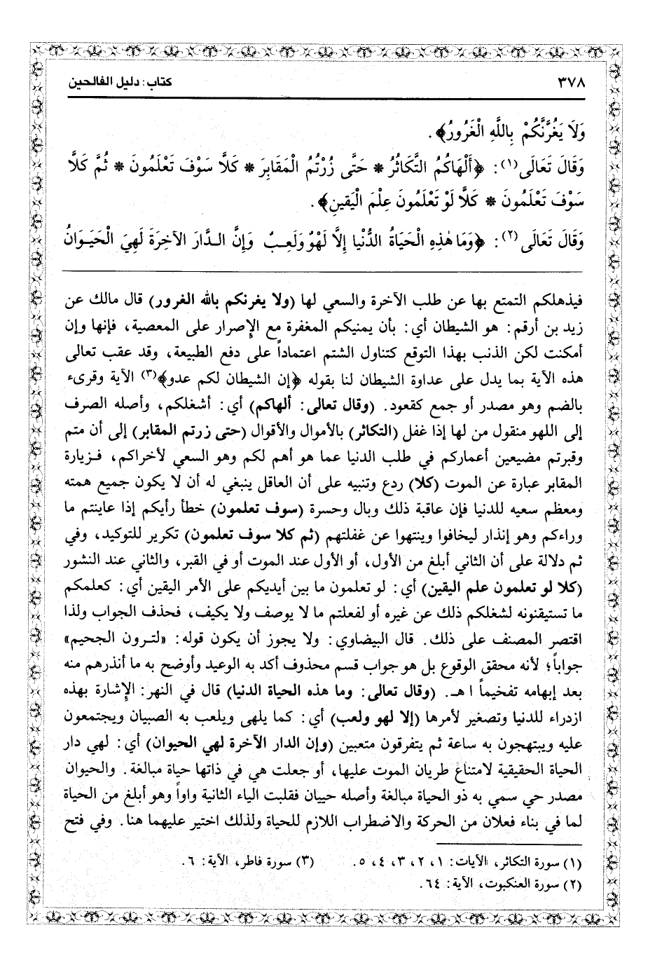 (وقال تعالى) : ( {ألهاكم} ) أي أشغلكم، وأصله الصرف إلى اللهو منقول من لها إذا غفل ( {التكاثر} ) بالأموال والأقوال ( {حتى زرتم المقابر} ) إلى أن متم وقبرتم مضيعين أعماركم في طلب الدنيا عما هو أهم لكم وهو السعي لأخراكم، فزيارة المقابر عبارة عن الموت ( {كلا} ) ردع وتنبيه على أن العاقل ينبغي له أن لا يكون جميع همته ومعظم سعيه للدنيا فإن عاقبة ذلك وبال وحسرة ( {سوف تعلمون} ) خطأ رأيكم إذا عاينتم ما وراءكم وهو إنذار ليخافوا وينتهوا عن غفلتهم ( {ثم كلا سوف تعلمون} ) تكرير للتوكيد، وفي ثم دلالة على أن الثاني أبلغ من الأول، أو الأول عند الموت أو في القبر، والثاني عند النشور ( {كلا لو تعلمون علم اليقين} ) أي لو تعلمون ما بين أيديكم على الأمر اليقين: أي كعلمكم ما تستيقنونه لشغلكم ذلك عن غيره أو لفعلتم ما لا يوصف ولا يكيف، فحذف الجواب ولذا اقتصر المصنف على ذلك. قال البيضاوي: ولا يجوز أن يكون قوله: {لترون الجحيم} جواباً لأنه محقق الوقوع بل هو جواب قسم محذوف أكد به الوعيد وأوضح به ما أنذرهم منه بعد إبهامه تفخيماً اهـ.......