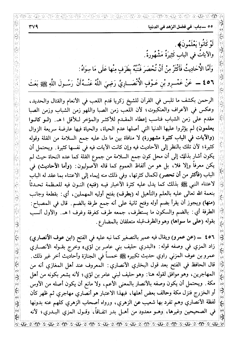 1456 - (عن عمرو) ويقال فيه عمير بالتصغير كما نبه عليه في «الفتح» (ابن عوف الأنصاري) زاد المزي في وصفه قوله «البدري حليف بني عامر بن لؤي» وخرج بقوله الأنصاري عمرو بن عوف المزنيّ راوي حديث تكبيره خمساً في الجنازة وأحاديث أخر غير ذلك. قال الحافظ في «الفتح» بعد قول البخاري الأنصاري: المعروف عند أهل المغازي أنه من المهاجرين، وهو موافق لقوله هنا: وهو حليف لبني عامر بن لؤي لأنه يشعر بكونه من أهل مكة. ويحتمل أن يكون وصفه بالأنصاري بالمعنى الأعم، ولا مانع أن يكون أصله من الأوس أو الخزرج فنزل مكة وحالف بعض أهلها، فبهذا الاعتبار هو أنصاري مهاجري، ثم ظهر كأن لفظة الأنصاري وهم تفرد به شعيب عن الزهري، ورواه أصحاب الزهري كلهم عنه بدونها في «الصحيحين» وغيرها، وهو معدود من أهل بدر اتفاقاً، وقول المزي. البدري لأنه