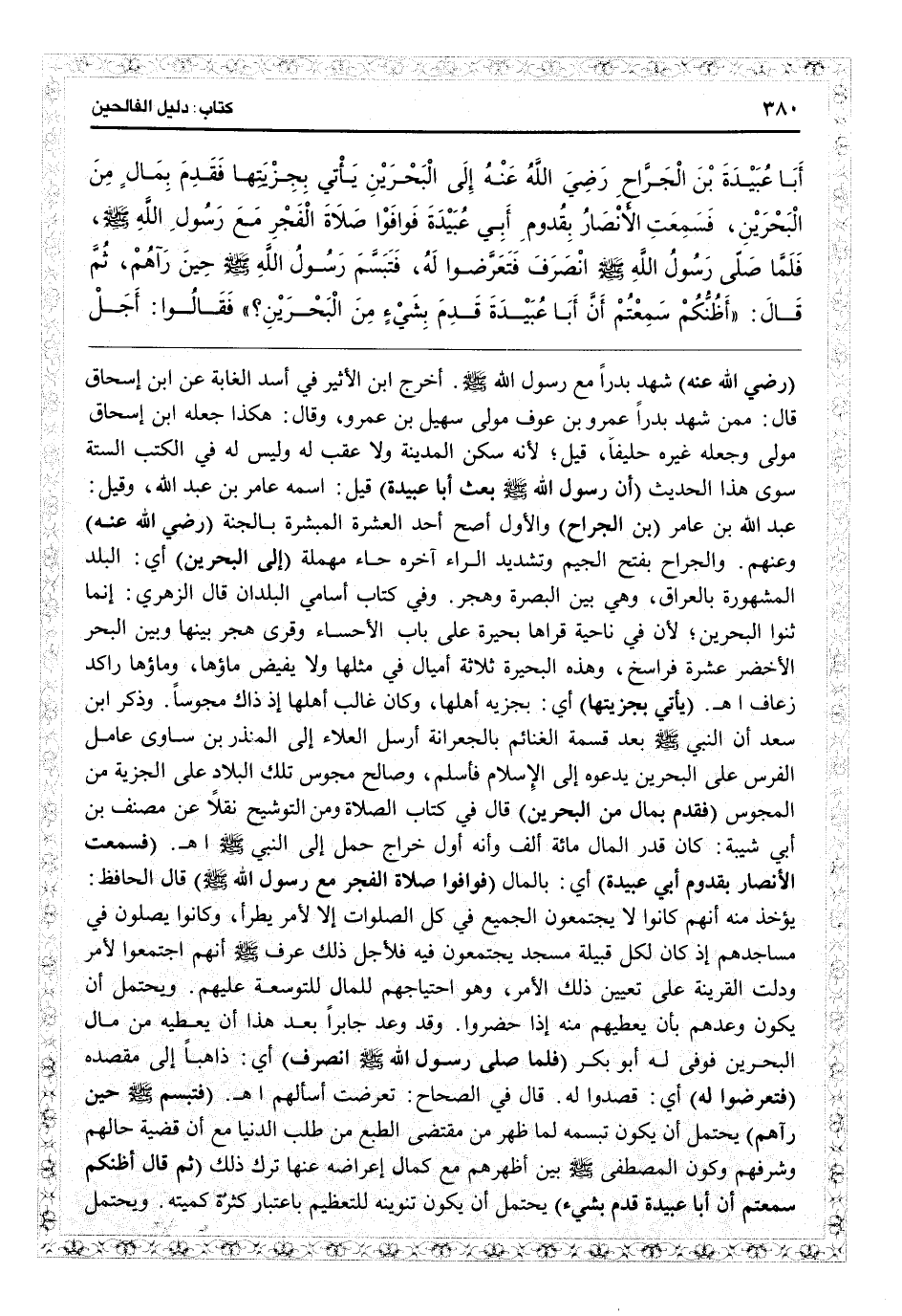 (رضي الله عنه) شهد بدراً مع رسول الله. أخرج ابن الأثير في «أسد الغابة» عن ابن إسحاق قال: ممن شهد بدراً عمرو بن عوف: مولى سهيل بن عمرو، وقال: هكذا جعله ابن إسحاق مولى وجعله غيره حليفاً، قيل لأنه سكن المدينة ولا عقب له، وليس له في الكتب الستة سوى هذا الحديث (أن رسول الله - صلى الله عليه وسلم - بعث أبا عبيدة) قيل اسمه عامر بن عبد الله، وقيل عبد الله بن عامر (بن الجراح) والأوّل أصح: أحد العشرة المبشرة بالجنة (رضي الله عنه) وعنهم. والجراح بفتح الجيم وتشديد الراء آخره حاء مهملة (إلى البحرين) أي البلدة المشهورة بالعراق، وهي بين البصرة وهجر. وفي كتاب «أسامى البلدان» قال الزهري: إنما ثنوا البحرين لأن في ناحية قراها بحيرة على باب الأحساء وقرى هجر بينها وبين البحر الأخضر عشرة فراسخ، وهذه البحيرة ثلاثة أميال في مثلها ولا يفيض ماؤها، وماؤها......